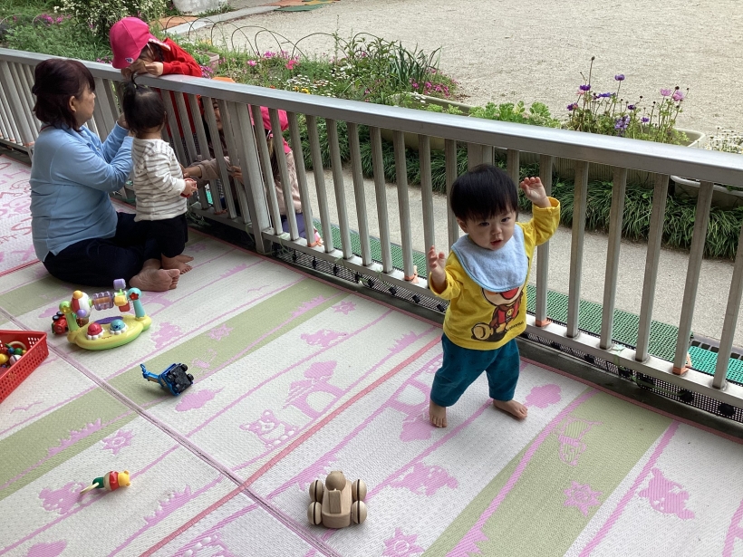 園庭で遊んでいるお兄さんお姉さんが「赤ちゃんかわいい!」と遊びにきてくれます。