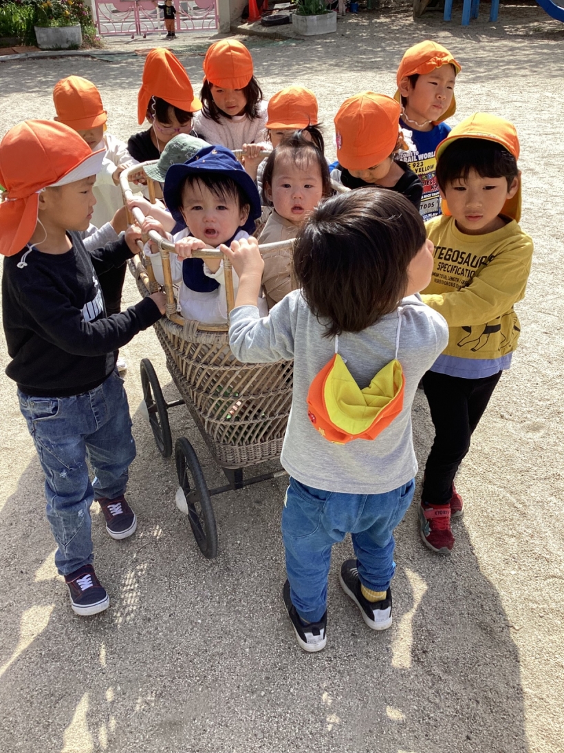 お兄さん、お姉さんに囲まれて園庭をお散歩しました。