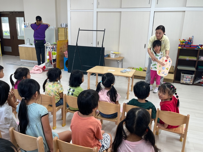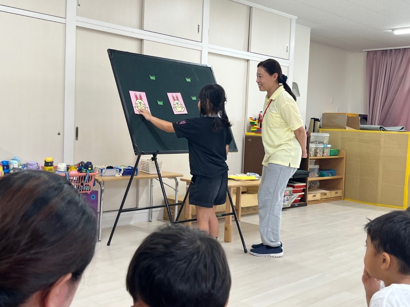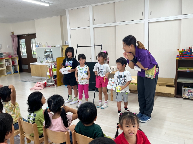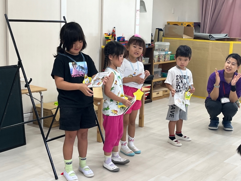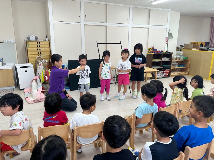 9月の誕生会 9月生まれの誕生会をしました! 名前と何歳になったのか、大きくなったら何になりたいかを聞くと、照れながらもみんなの前でお話しをしてくれました♪ 保育者の出し物ではマジックショーをしました。 9月生まれの子どもたちに選んでもらった絵やカードなどを見ないで当てるとびっくりした表情をしていました。