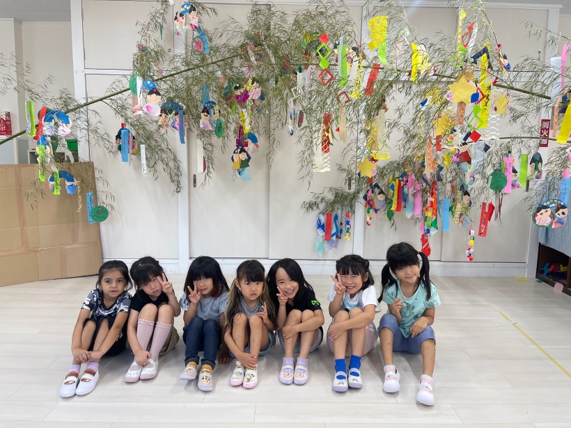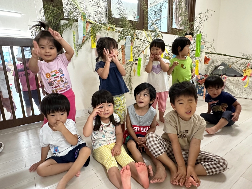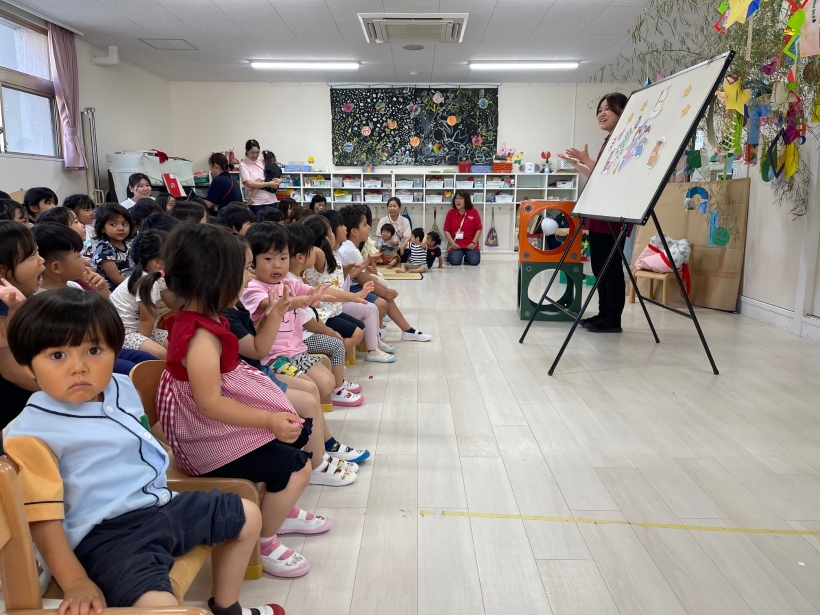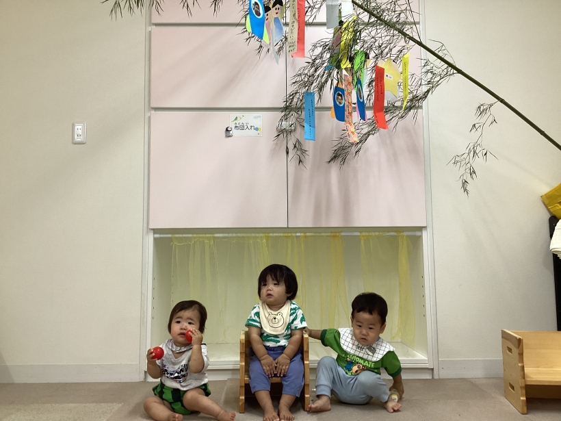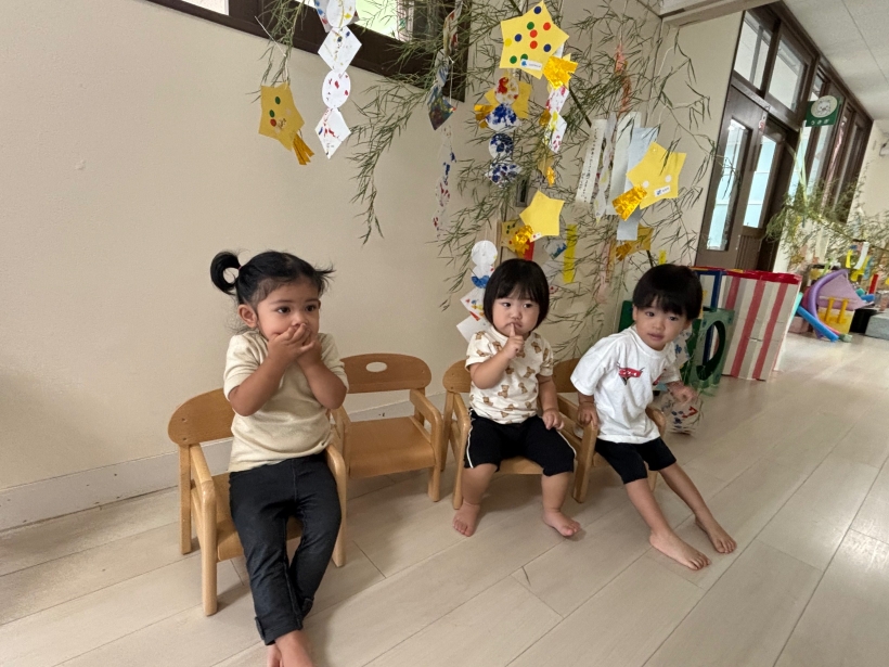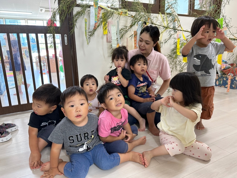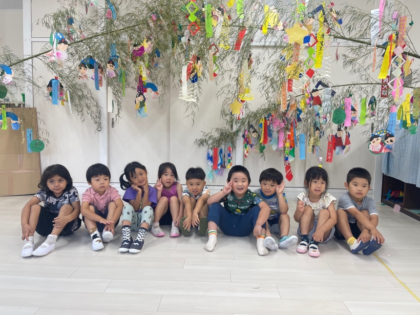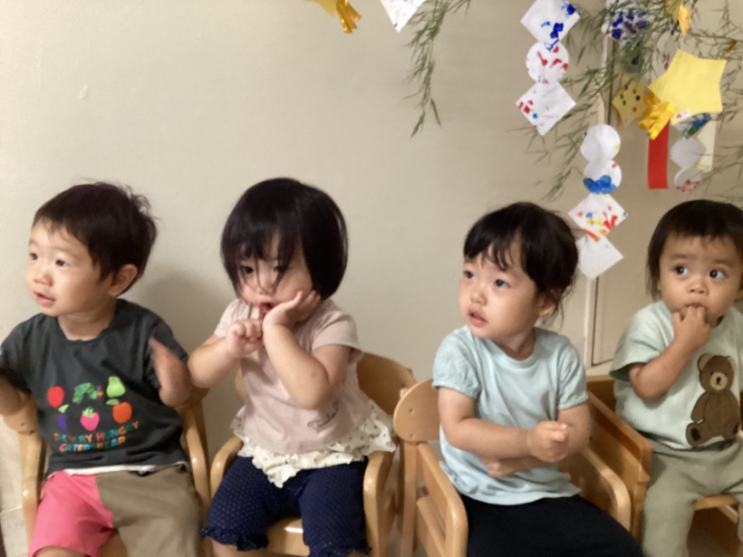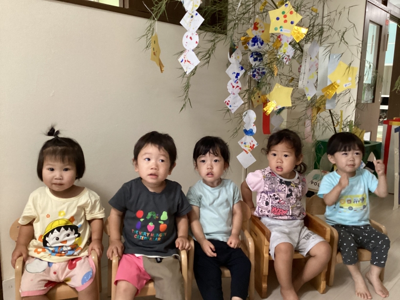 【七夕会】 みんなの部屋で七夕会を行いました。 最初に、各クラスの笹飾りの紹介をしました。 かわいくて、素敵な笹飾りに興味深々な子どもたちでした。 次に「たなばた」のパネルシアターを見ました。 お話しを夢中になって聞いていました。織姫と彦星が出会える場面では、ホッとした表情をしている子もいました。 最後は「たなばたさま」の歌をみんなで歌って 笹の前で写真を撮りました! 乳児さんも笹の前で写真を撮りました♪ うさぎ組さん りす組さん ひよこ組さん