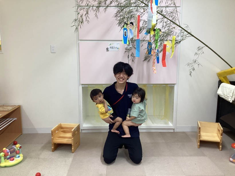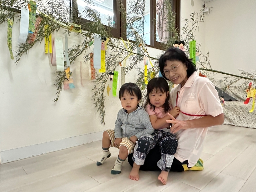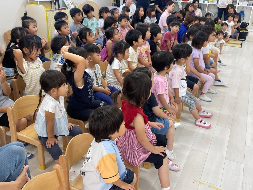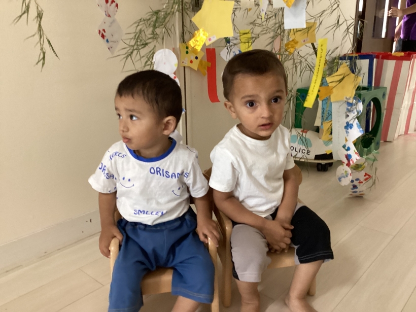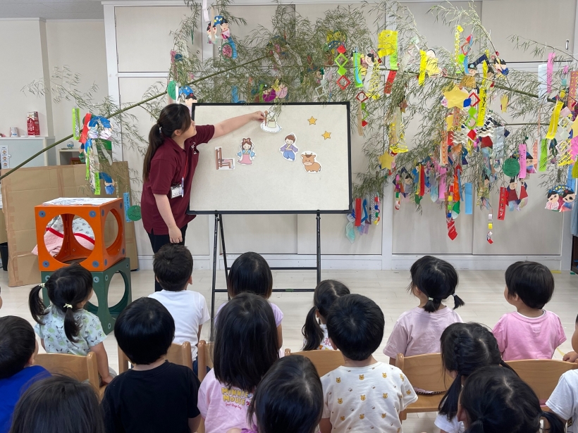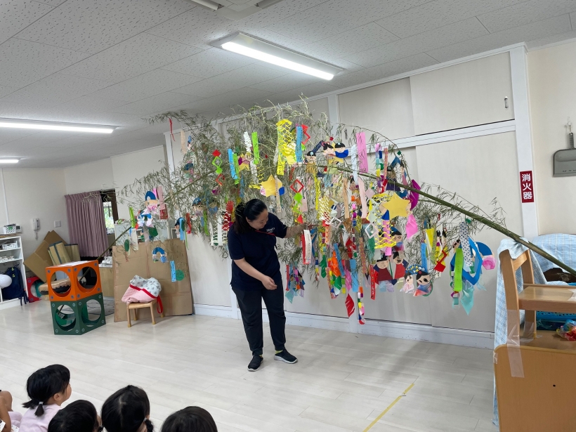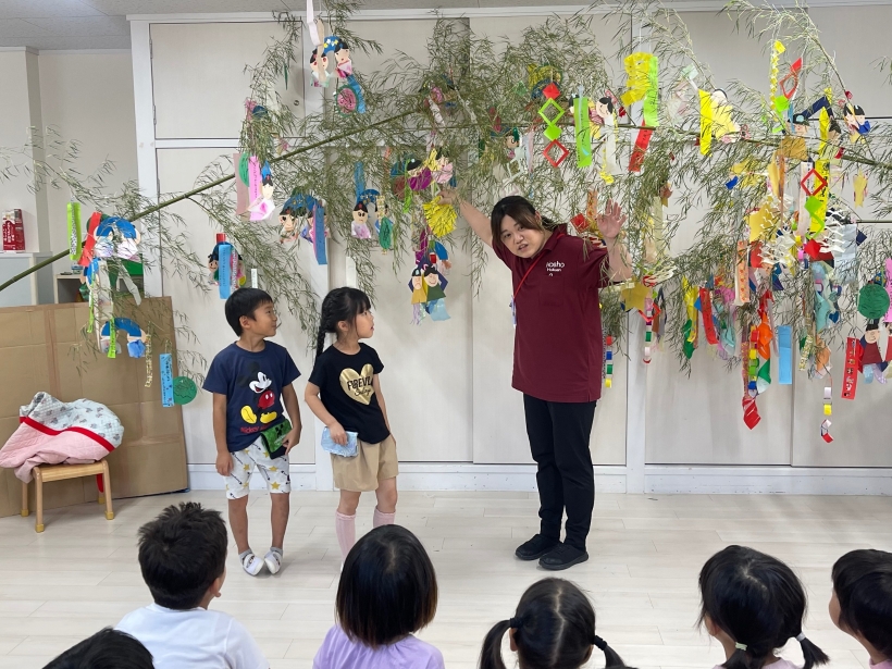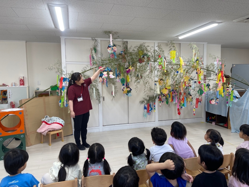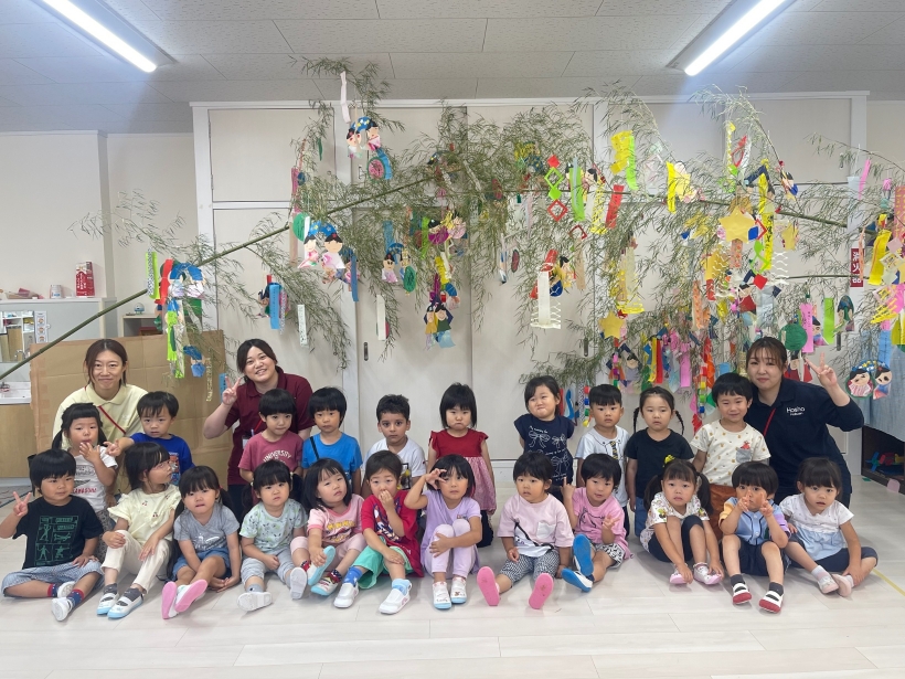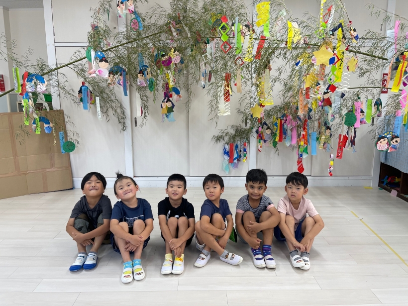 【七夕会】 みんなの部屋で七夕会を行いました。 最初に、各クラスの笹飾りの紹介をしました。 かわいくて、素敵な笹飾りに興味深々な子どもたちでした。 次に「たなばた」のパネルシアターを見ました。 お話しを夢中になって聞いていました。織姫と彦星が出会える場面では、ホッとした表情をしている子もいました。 最後は「たなばたさま」の歌をみんなで歌って 笹の前で写真を撮りました! 乳児さんも笹の前で写真を撮りました♪ うさぎ組さん りす組さん ひよこ組さん
