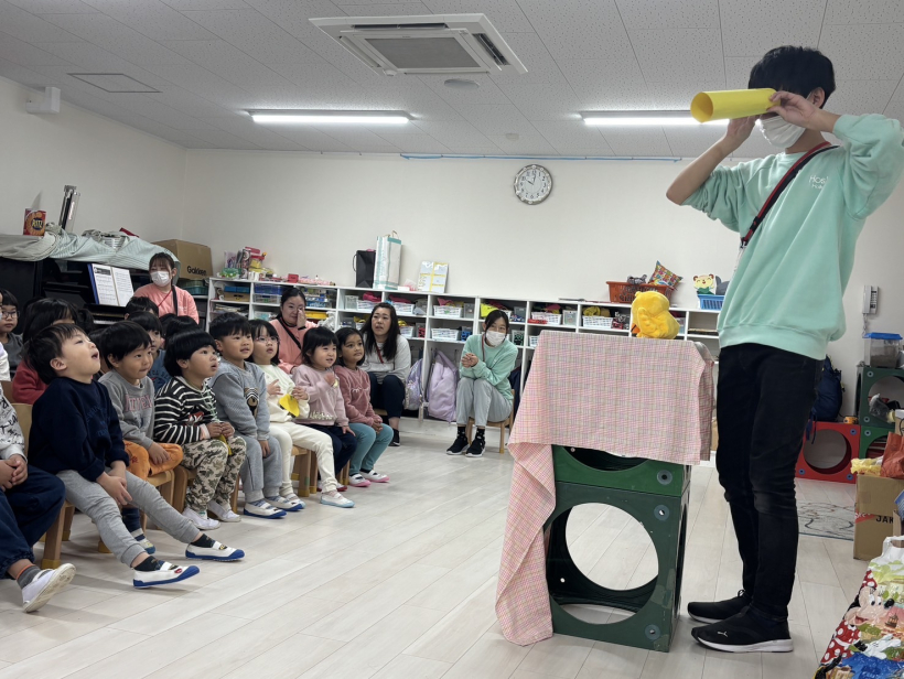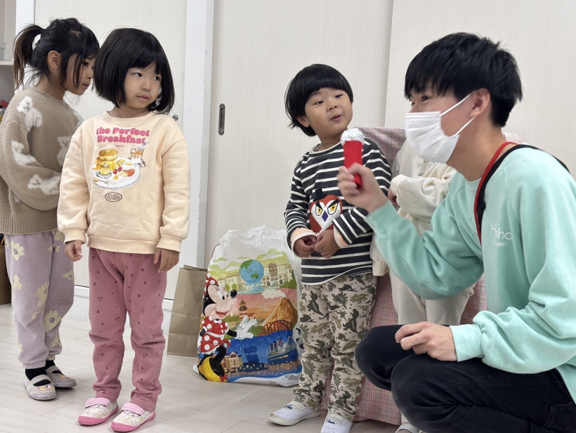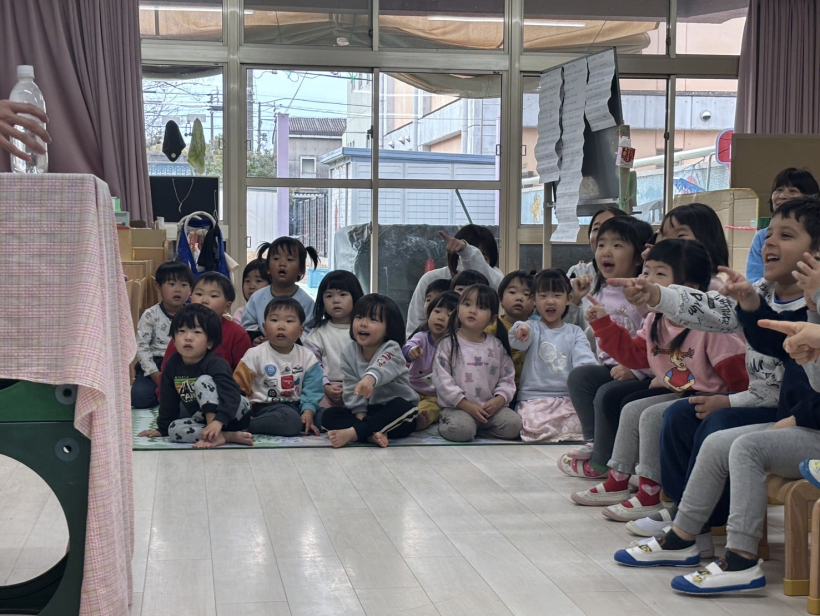 中身が空洞の筒の中から、みんなで「ちちんぷいぷい」をするとシフォンの布が出てきて、「なんでー」「すごーい」と驚いている姿がありました。
