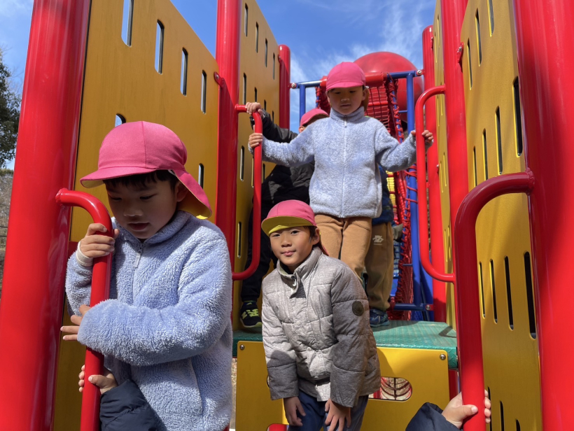 大型遊具は高さがあったので、初めの方は保育者と一緒に遊んでいた子も、繰り返し遊んでいくうちに一番高い滑り台を一人で滑れるようになっていました!