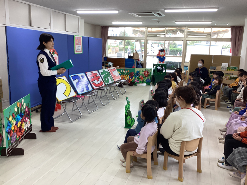 3月6日に愛知県警察本部から防犯活動専門チームの”のぞみ”の方達が来てくださり、子ども達に防犯教室をしてくれました!
