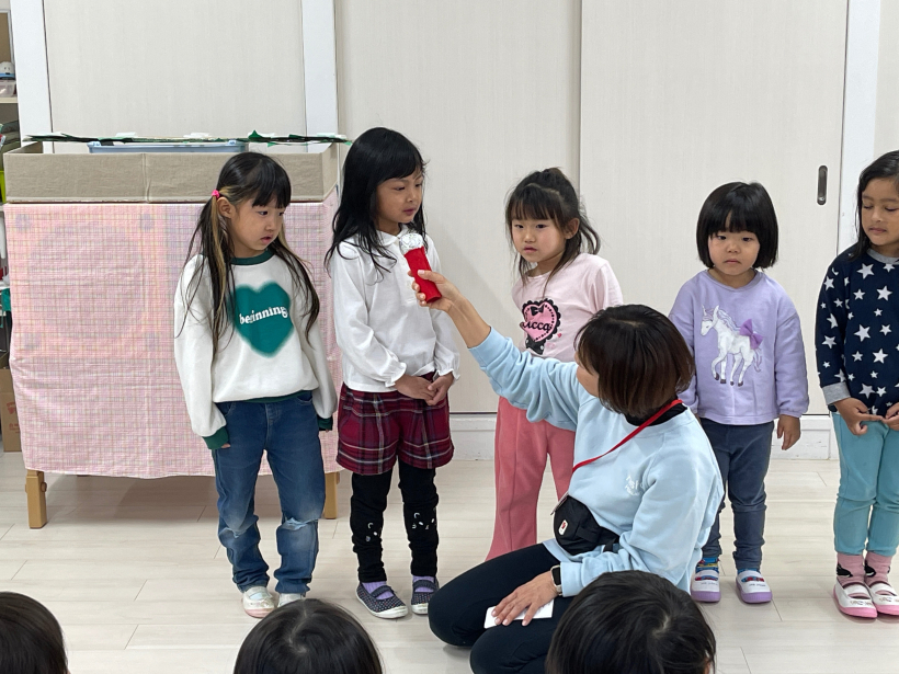 みんなで歌でお祝いした後は先生たちの出し物の人形劇です。