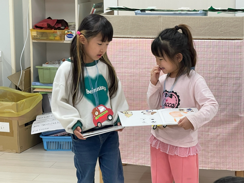 担任の先生からペンダントをかけてもらい、絵本のプレゼントをもらうと嬉しそうに中を見ていました。