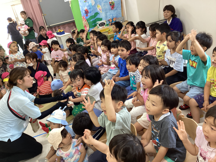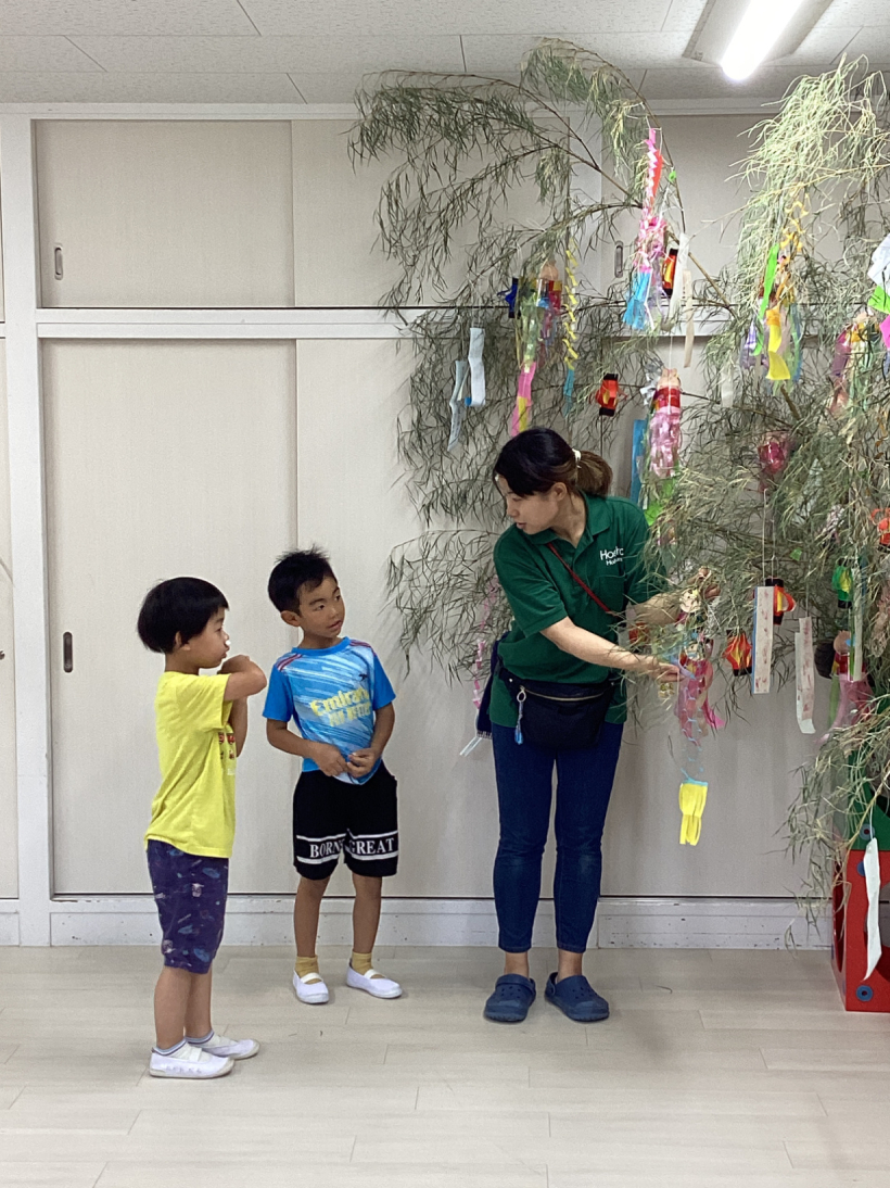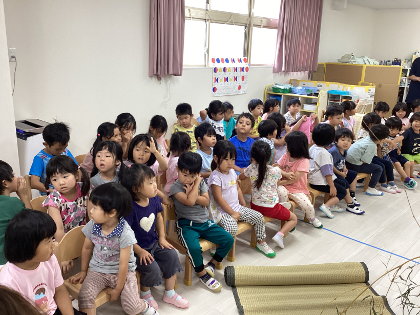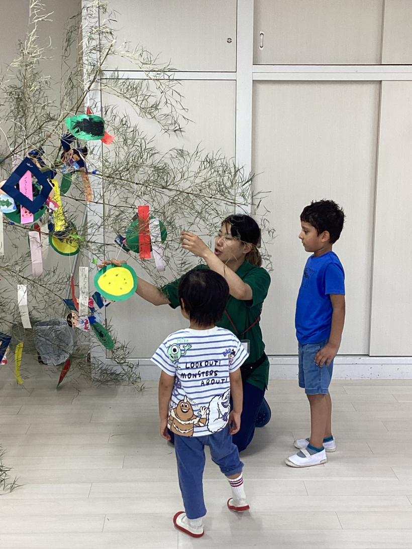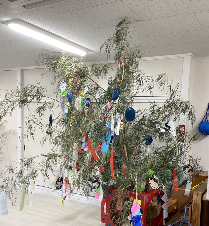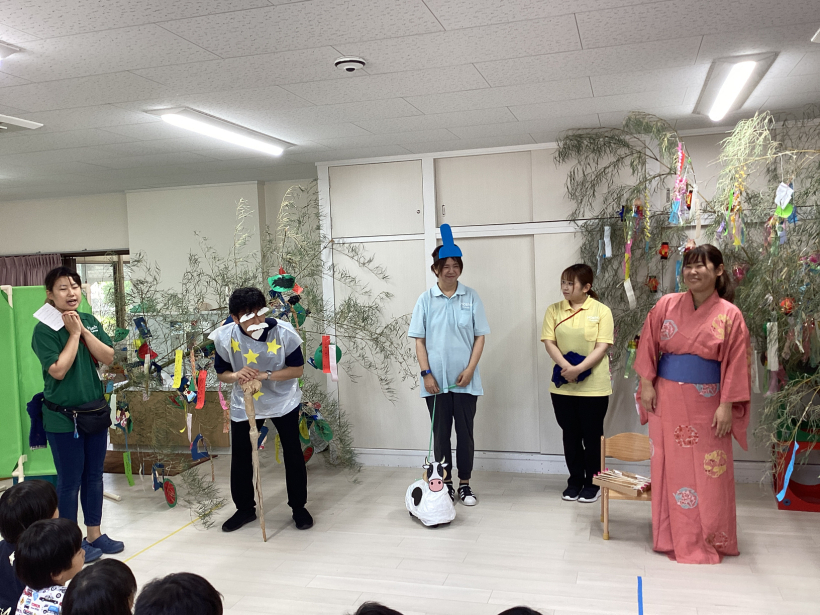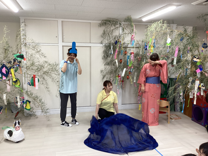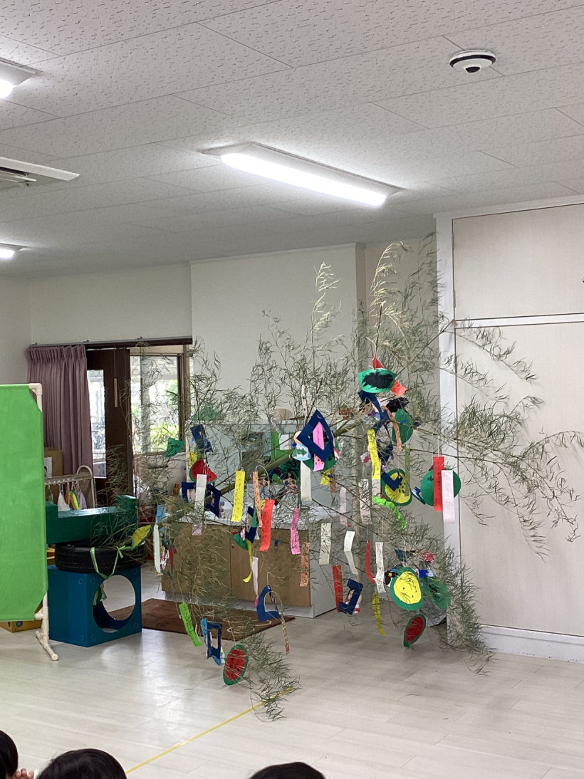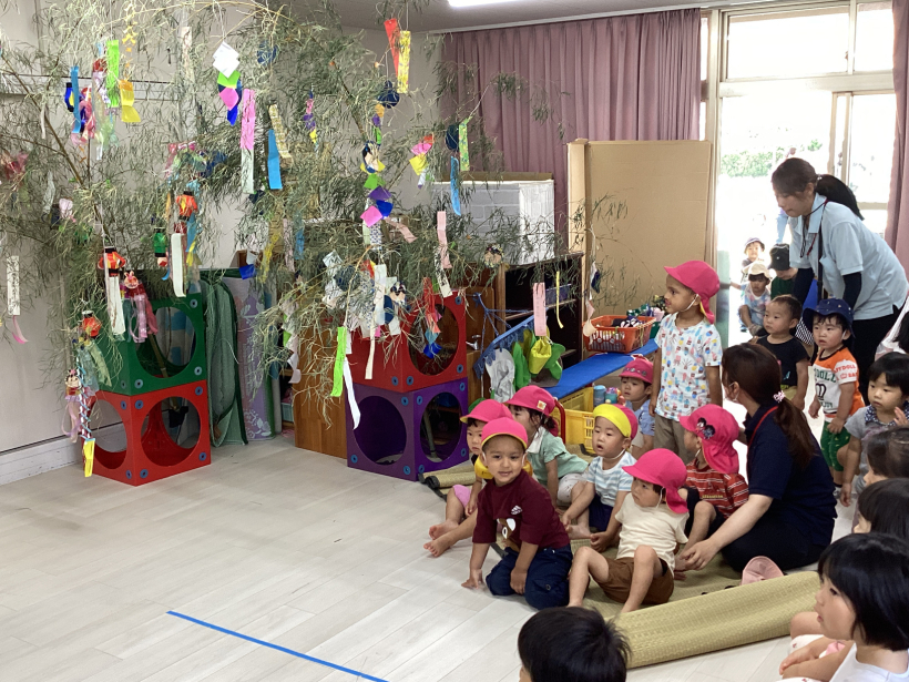 七夕会 色とりどりの飾りや短冊が見守る中、七夕まつりを行いました。 クラスごとに、どうやって七夕飾りを作ったのか聞いてみると「ハサミできった」や「のりつかった」など緊張しながらも、作った時を思い出しながら教えてくれました。 先生たちの劇では、七夕まつりについてのお話をしました。 織姫と彦星はなぜ天の川で分けられるようになったのか、を楽しく劇にしました。また聞いて見てください。 劇には、乳児クラスも見にきてくれました。 最後はみんなで一緒に七夕の歌を元気いっぱいに歌いました。