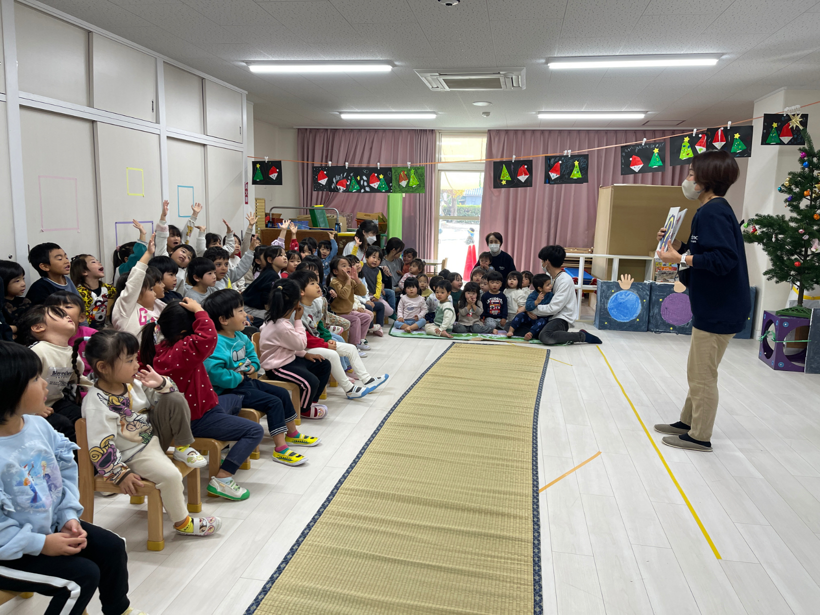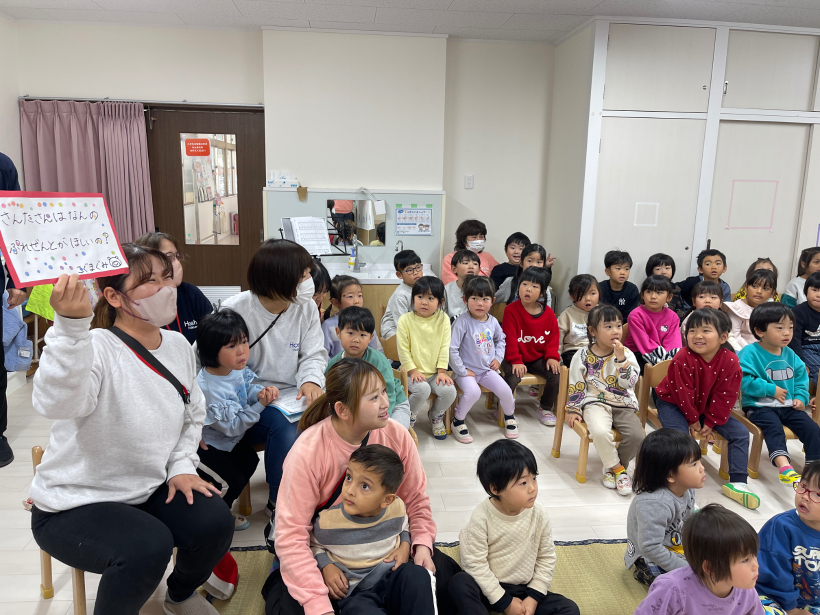 そしてサンタさんへの質問コーナーではこぐま組、きりん組、ぞう組それぞれ一つずつ質問をしてサンタさんが答えてくれました。