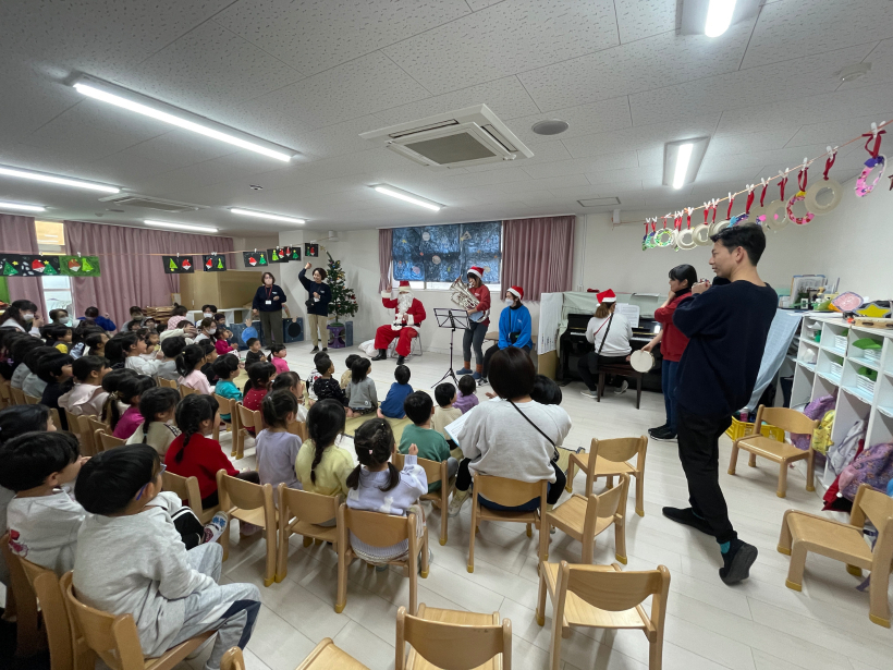 その後は先生たちからの出し物で、ピアノ、ユーフォニアム、カホンの演奏をサンタさんと一緒に聴きました。