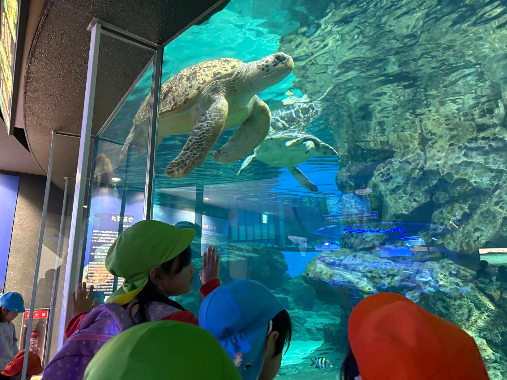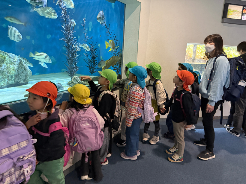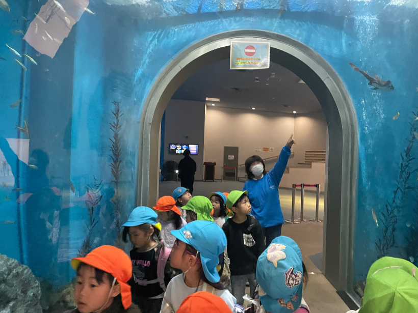ダイバーさんが水槽を掃除する場面も見られたり、大きな魚、小さな魚、身近な水辺の生き物を見て、一つひとつの反応が本当に可愛い子どもたちでした。