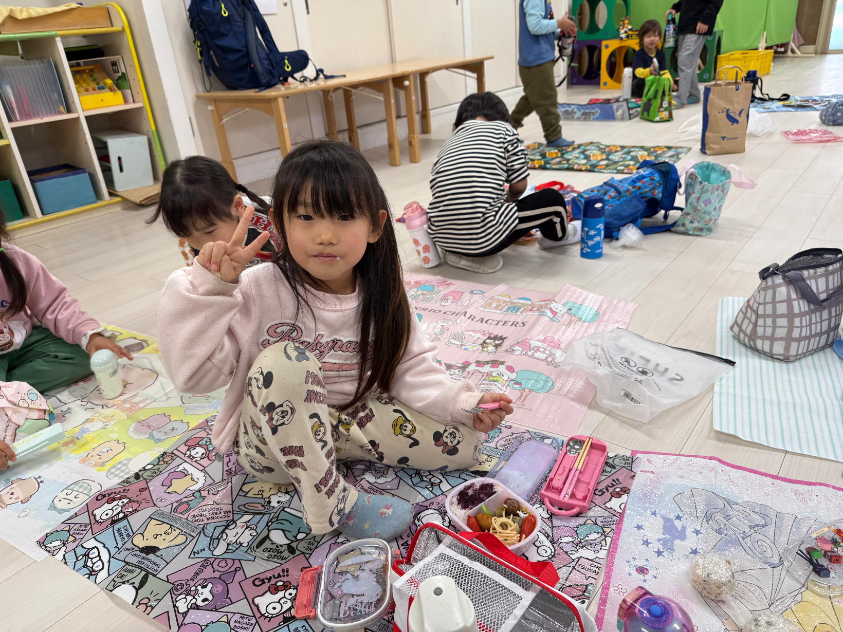 きりん組かぞう組の部屋の好きな方で食べてOKにすると、仲のいい友だちと話して同じ部屋で食べたり、行ってみたい部屋にカバンを持って行ったりしていました。