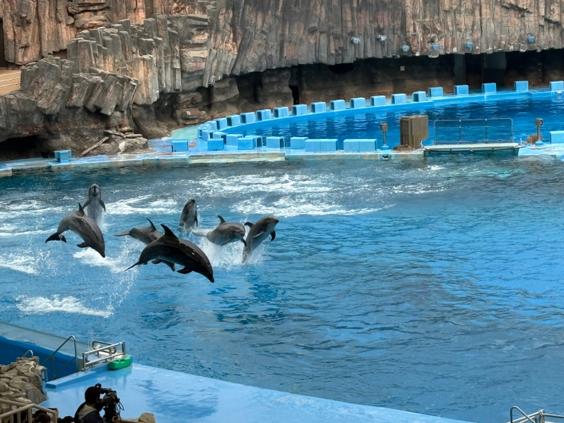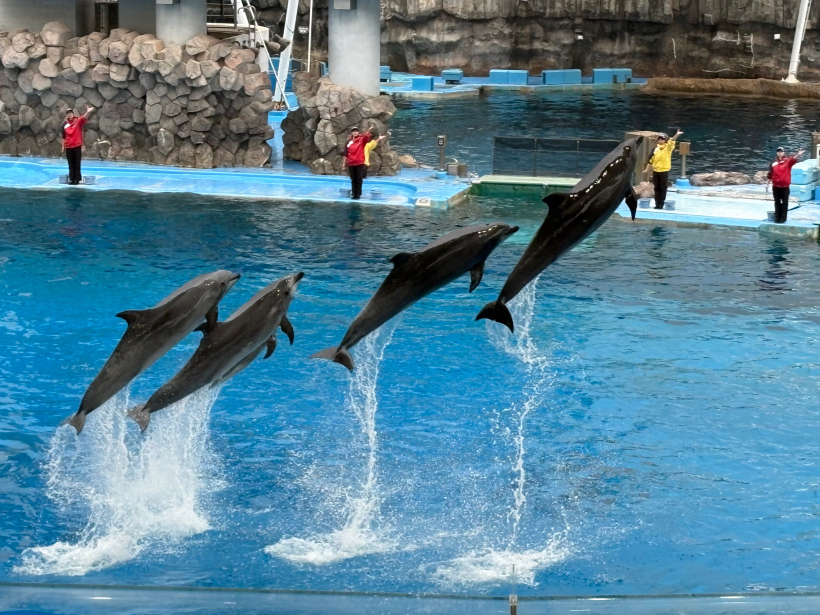 たくさんのイルカが並んでジャンプしたり、高いボールにタッチしたりすると「すっごーい!」と拍手したり、手拍子で応援したりしていました。