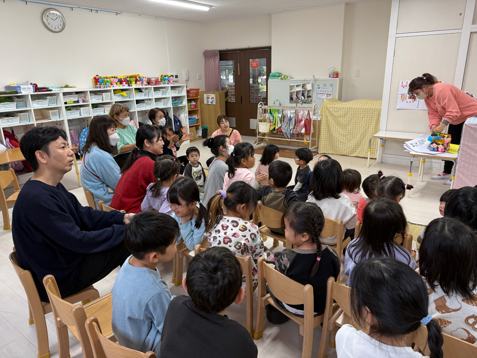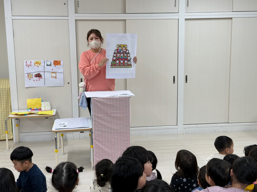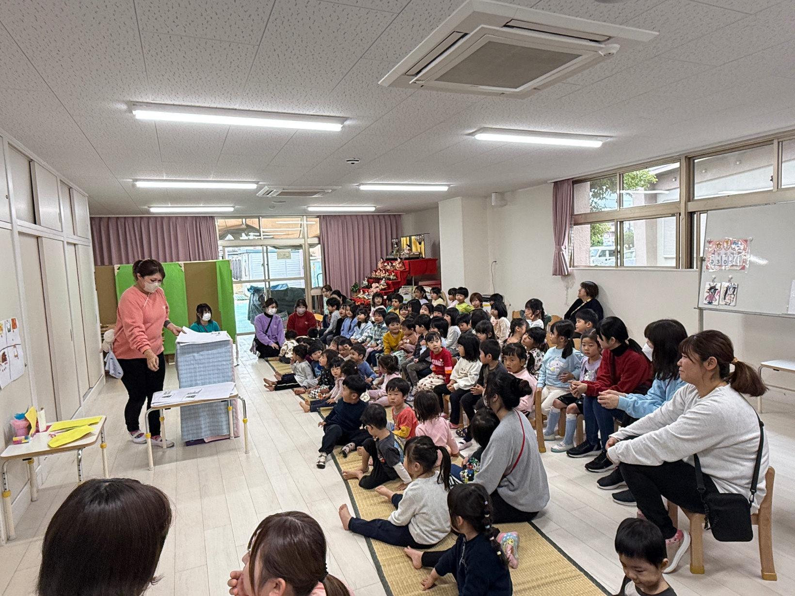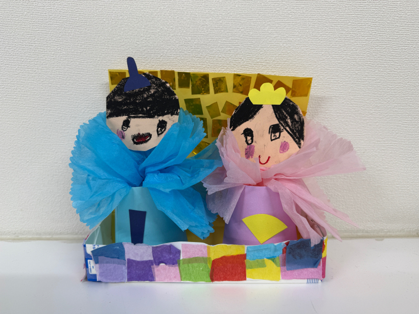 ひなまつり会 ぞう組に集まって、ひなまつり会をしました。 ひなまつりについての紙芝居を見ながらひな飾りの1段目はお内裏さまとお雛様で2段目は3人官女などの話を聞きました。 各クラスで素敵なひな飾りが出来たのでみんなに紹介して「うれしいひなまつり」を歌いました。