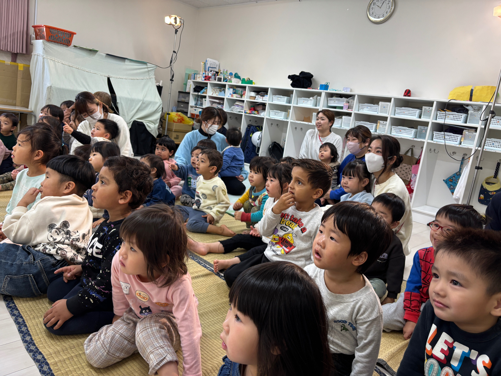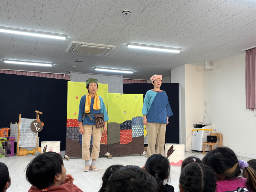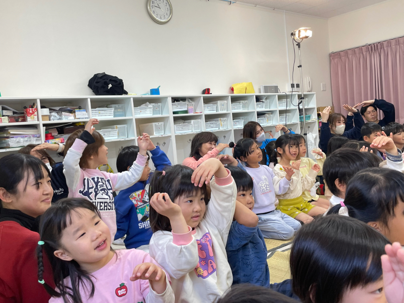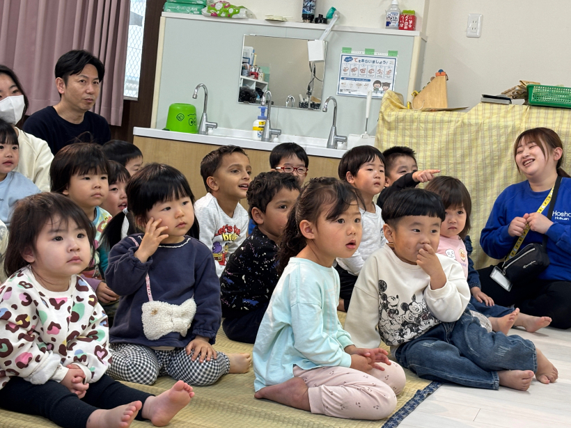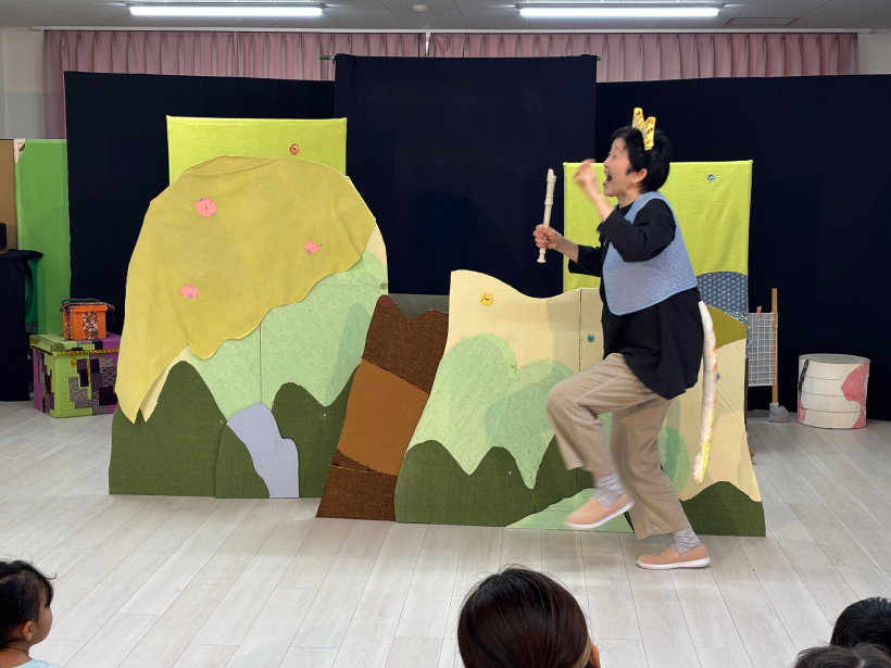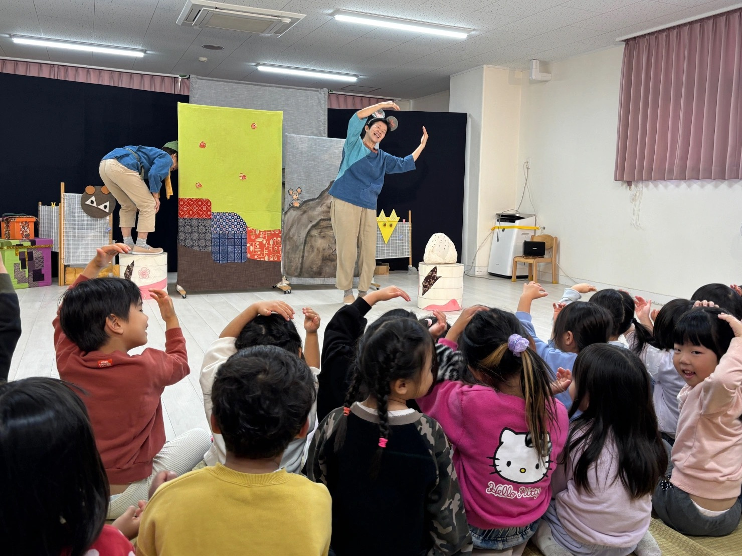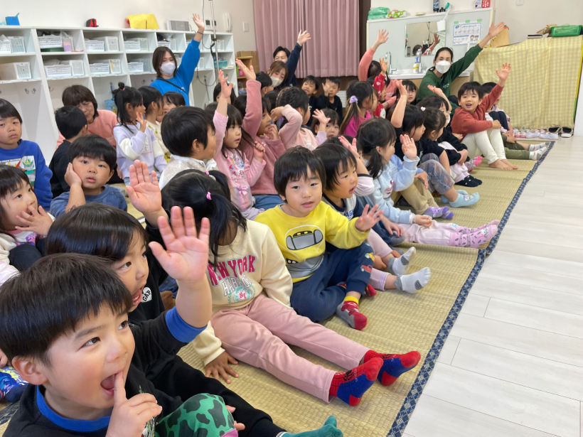 劇鑑賞 劇鑑賞 「劇団むう」の劇を見ました。(父母の会主催です) 乳児クラスは「半分こ」「ねこ」の劇を見ました。 音楽に合わせて体を揺らしたり、笑ったりと楽しんでいました。 幼児クラスは「おむすびころりん」の劇を見ました。 父母会の皆さまのご協力のおかげで、子どもたちはネズミと一緒に歌ったり踊ったり、愉快な仕掛けに笑ったりしながら、楽しい時間を過ごすことができました。 「たのしかった!」「どうやってやっていたの?」と、子どもたちのワクワクした声もたくさん聞かれました。