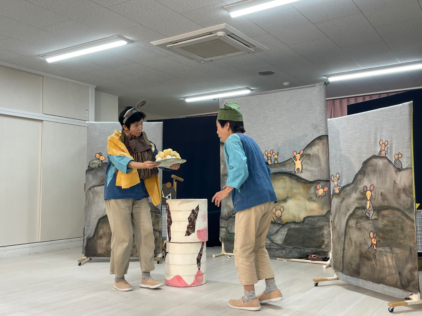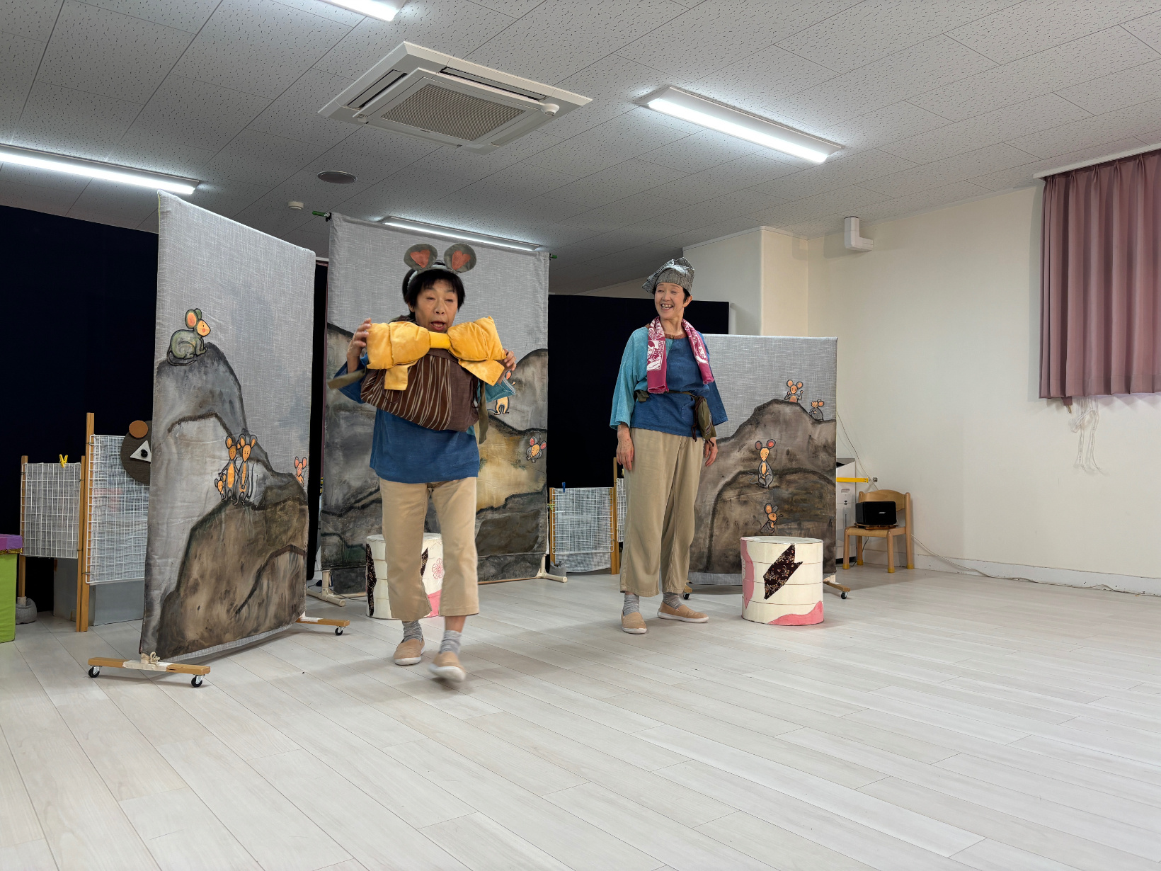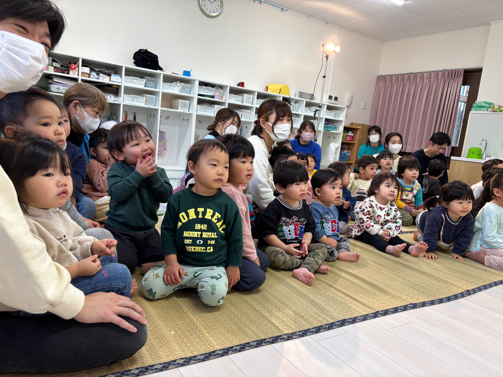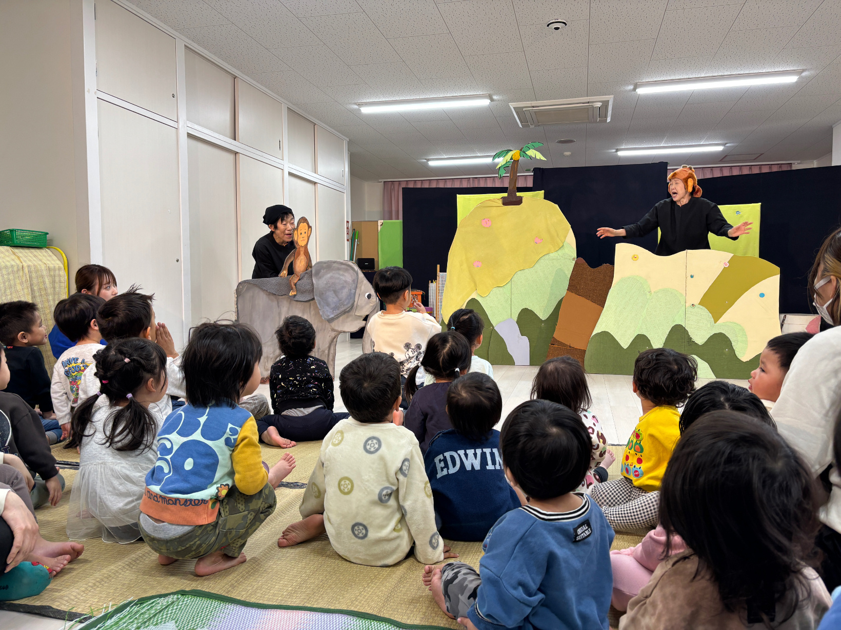 劇鑑賞 劇鑑賞 「劇団むう」の劇を見ました。(父母の会主催です) 乳児クラスは「半分こ」「ねこ」の劇を見ました。 音楽に合わせて体を揺らしたり、笑ったりと楽しんでいました。 幼児クラスは「おむすびころりん」の劇を見ました。 父母会の皆さまのご協力のおかげで、子どもたちはネズミと一緒に歌ったり踊ったり、愉快な仕掛けに笑ったりしながら、楽しい時間を過ごすことができました。 「たのしかった!」「どうやってやっていたの?」と、子どもたちのワクワクした声もたくさん聞かれました。