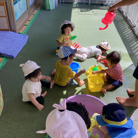 新しいお友達も加わりにぎやかなひよこ組さんです。 テラスでの水遊びで...