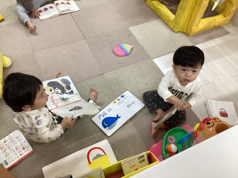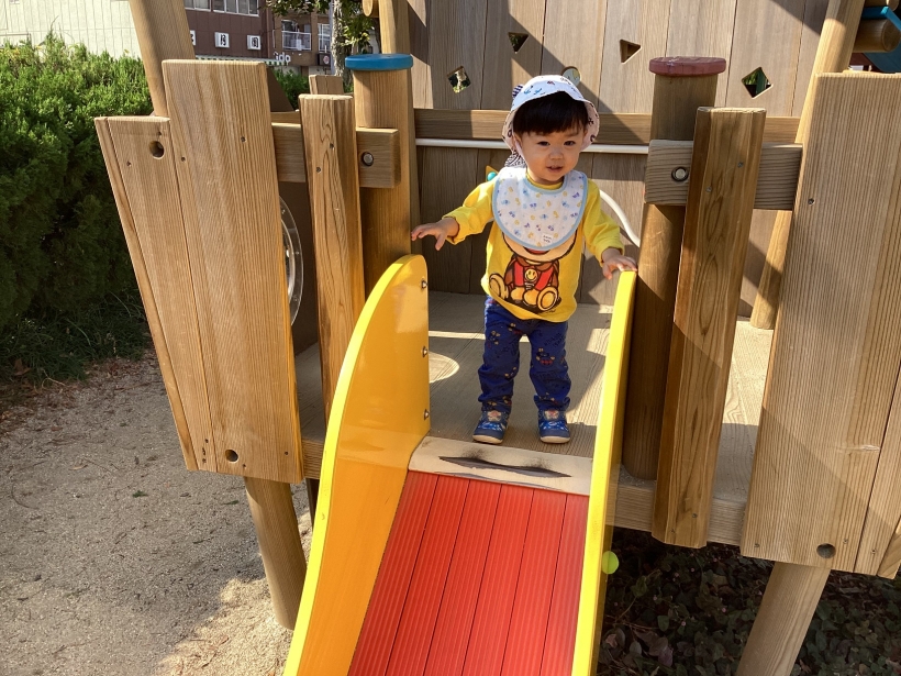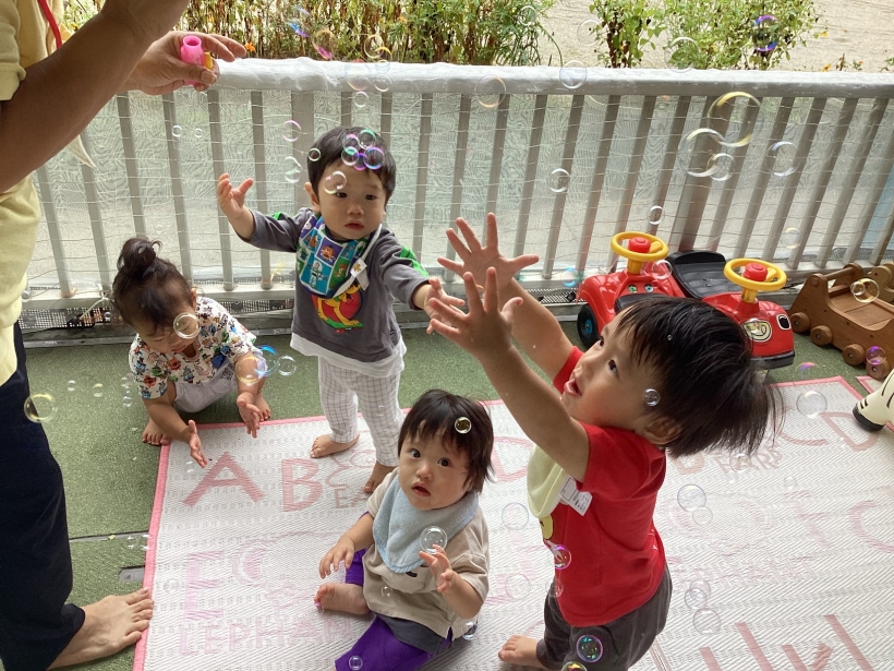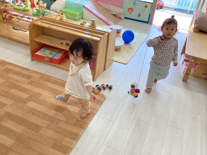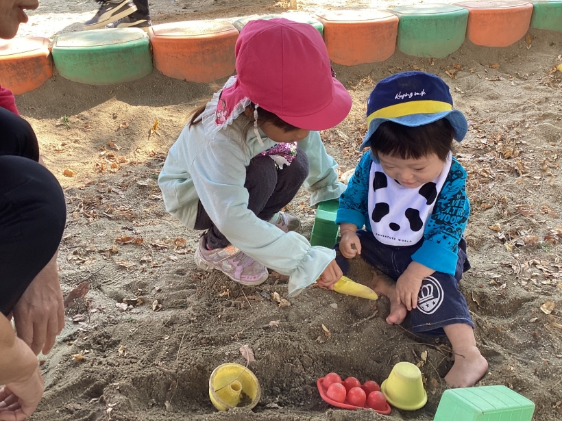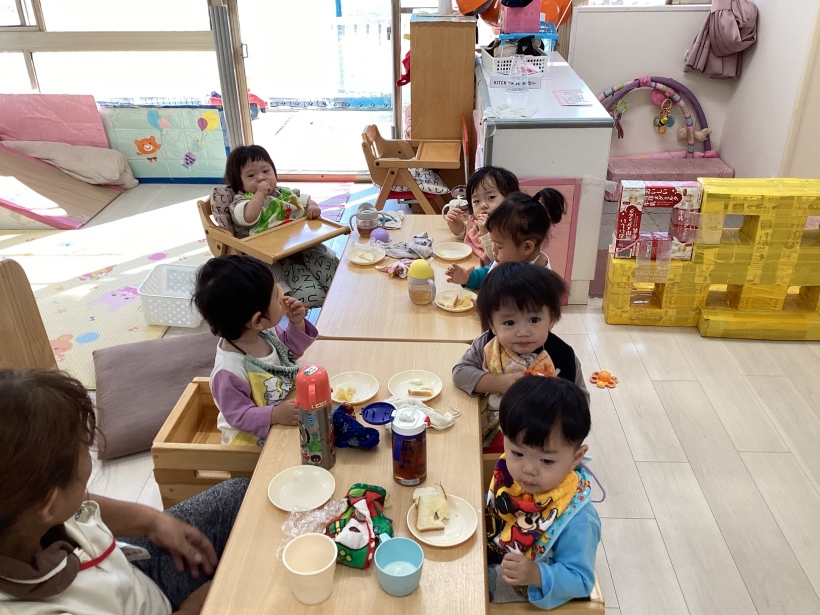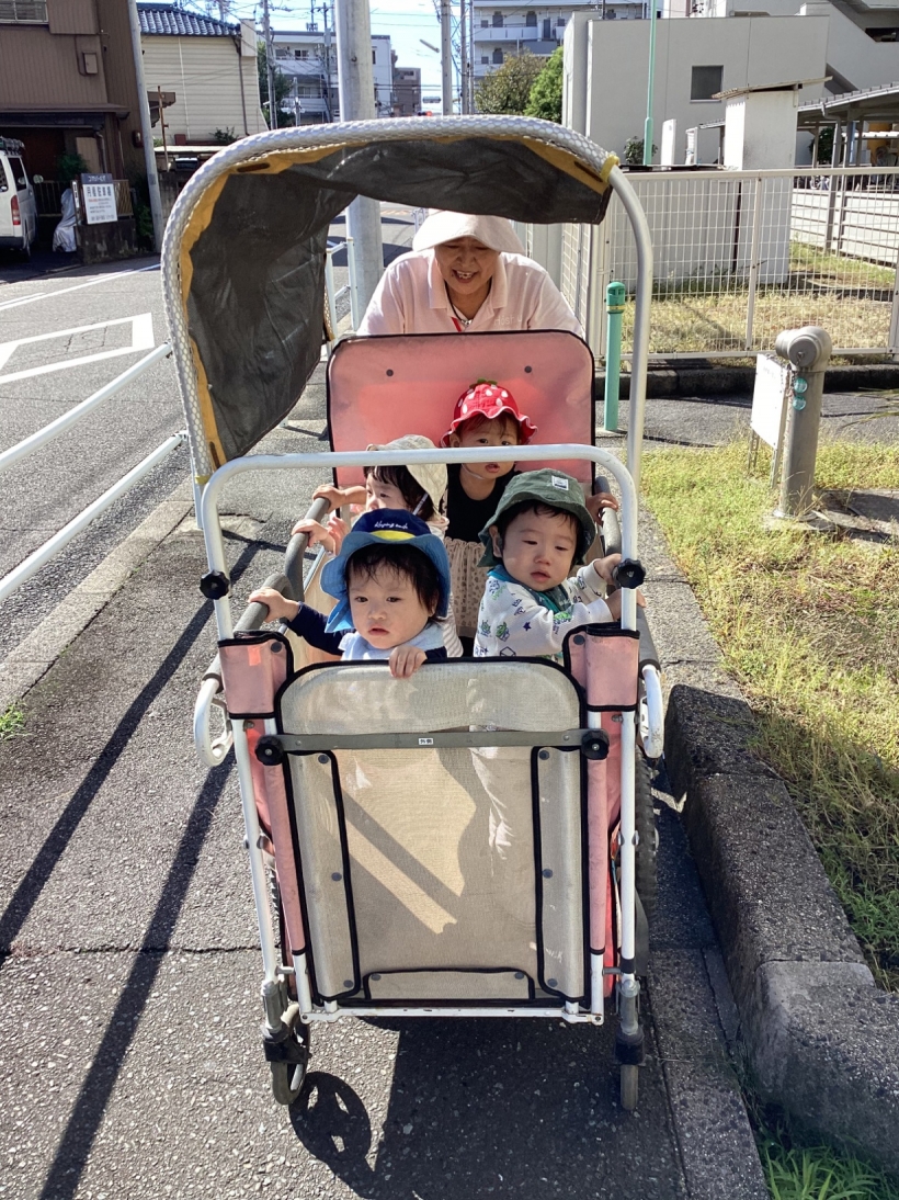 ひよこぐみだより【10月】 近くの公園にカートでお散歩に行きました。 読書の秋⁉︎ 絵本を自分で見るのも、読んでもらうのも大好きです! お友達の遊んでいる様子を見て興味を持ったり、一緒に楽しむ姿も見られるようになりました。 子どもたちの大好きなおやつは、みんなで一緒に同じものが食べられるようになりました! 外遊びはできることが増えて楽しみも広がっています♫