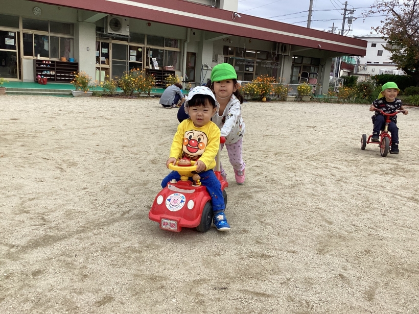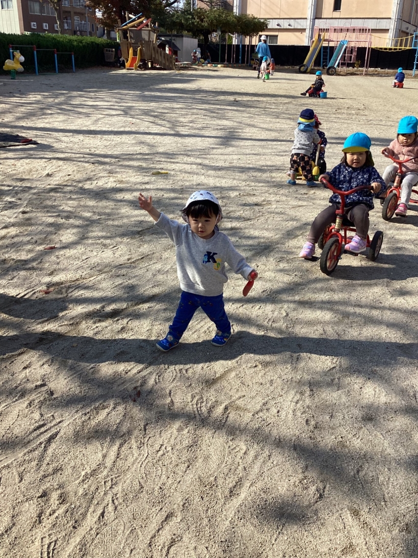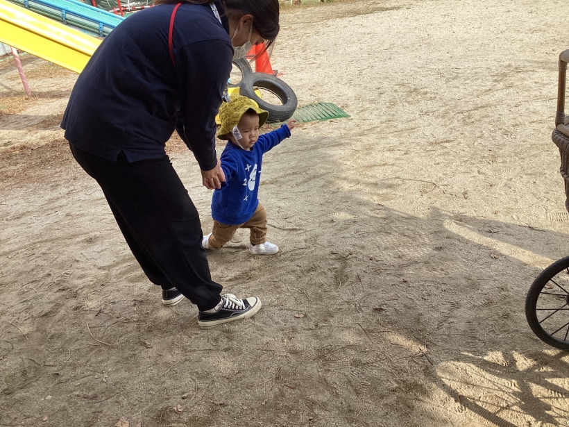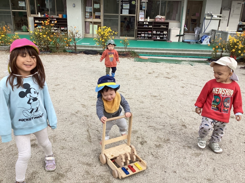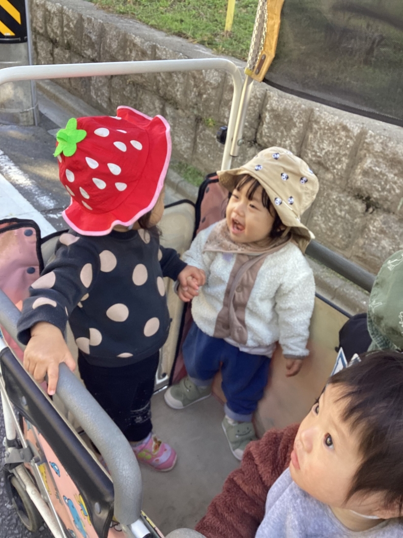 ひよこぐみだより【11月】 気持ちの良い気候が続き、園庭でのびのびと遊んでいるひよこ組さん 泣いているお友達を気にかける姿も見られます。 新しいお友だちも保育者と遊んだり、お気に入りの場所をみつけたりする中で、笑顔がみられるようになってきました。 カートで近くの公園へお散歩に行きました。