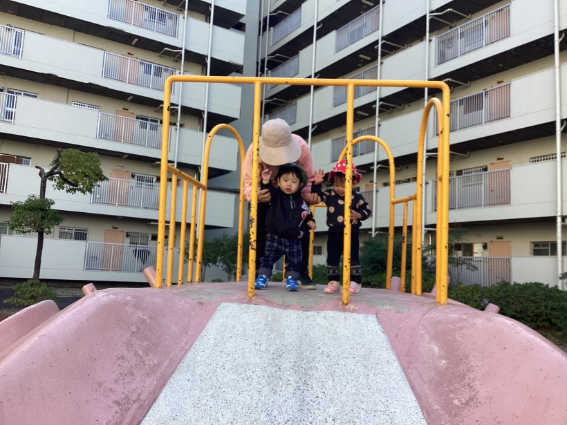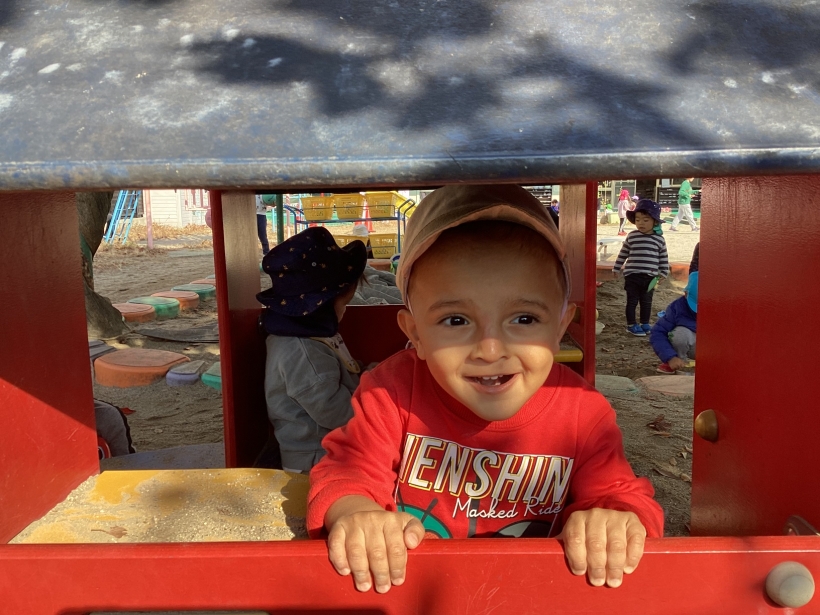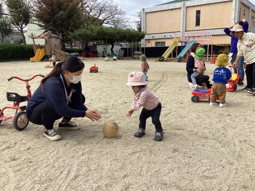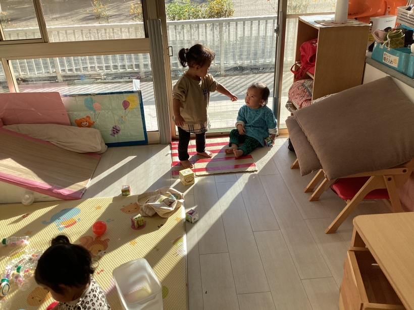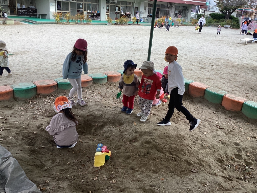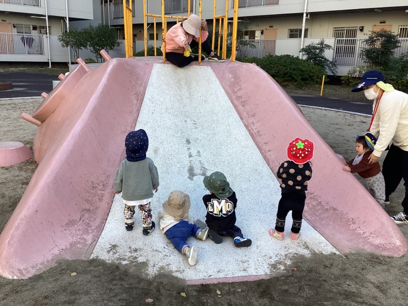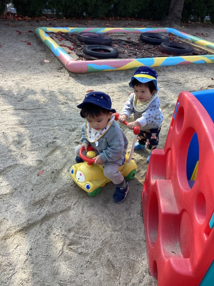 ひよこぐみだより【11月】 気持ちの良い気候が続き、園庭でのびのびと遊んでいるひよこ組さん 泣いているお友達を気にかける姿も見られます。 新しいお友だちも保育者と遊んだり、お気に入りの場所をみつけたりする中で、笑顔がみられるようになってきました。 カートで近くの公園へお散歩に行きました。