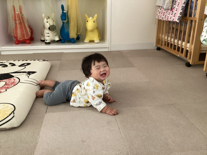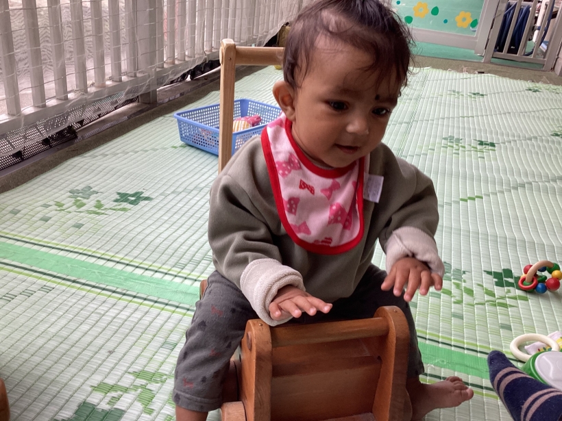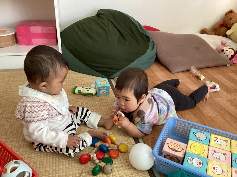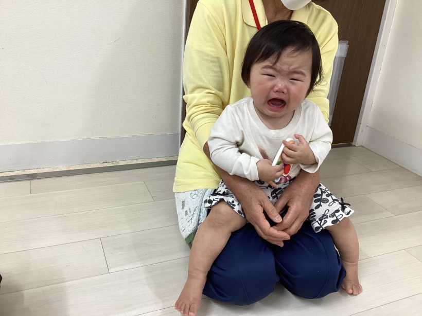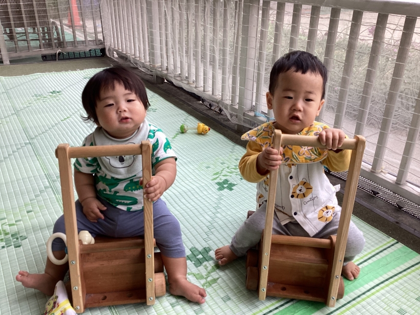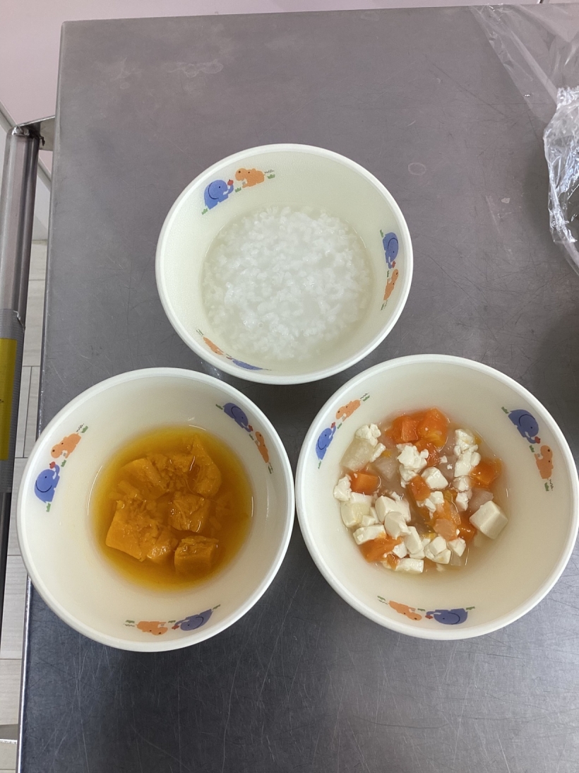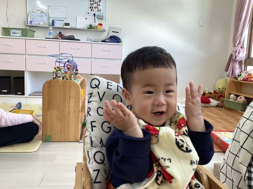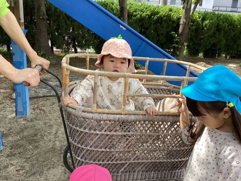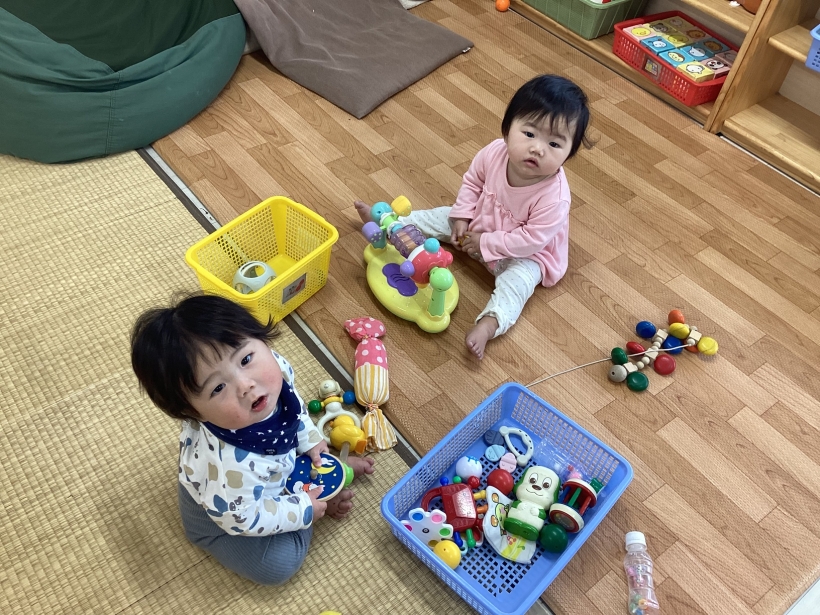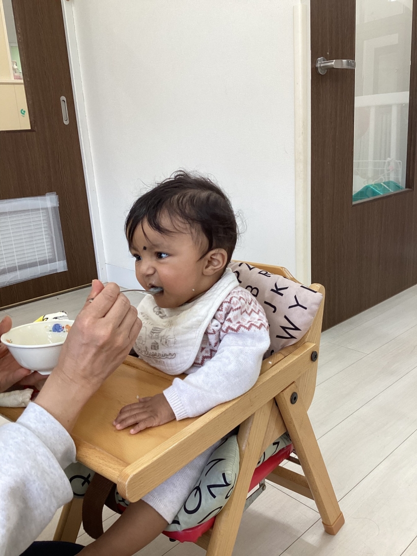 ひよこぐみだより【4月】 園の離乳食(中期)です。 保育士と一緒に順番に食べます。”おいしい”の顔も見せてくれました ママと離れて泣くこともありますが、ご機嫌で過ごせる時間も増えてきました。 興味のあるおもちゃに手を伸ばしたり、ハイハイやずりばいで移動しながら遊んでいます。 お天気の良い日は乳母車で園庭を散歩します。