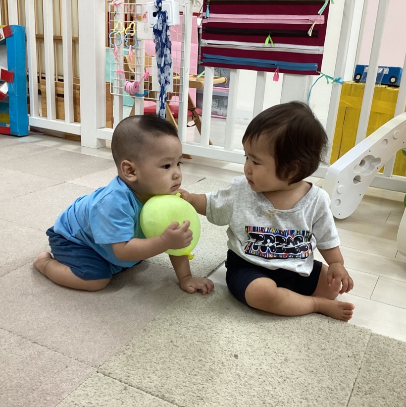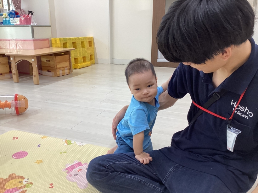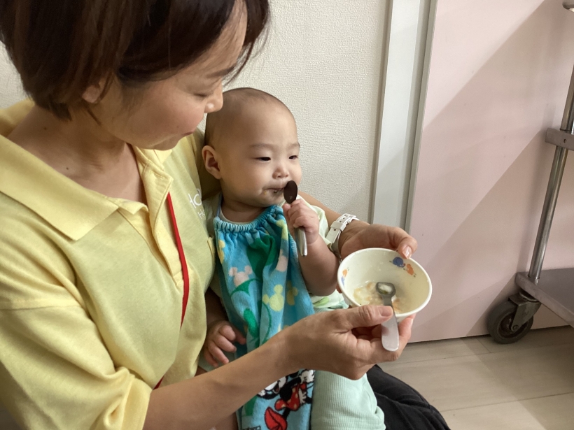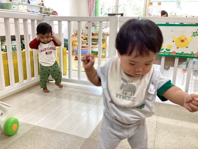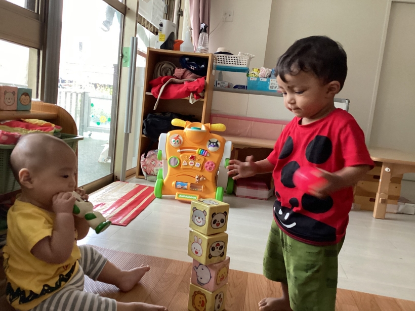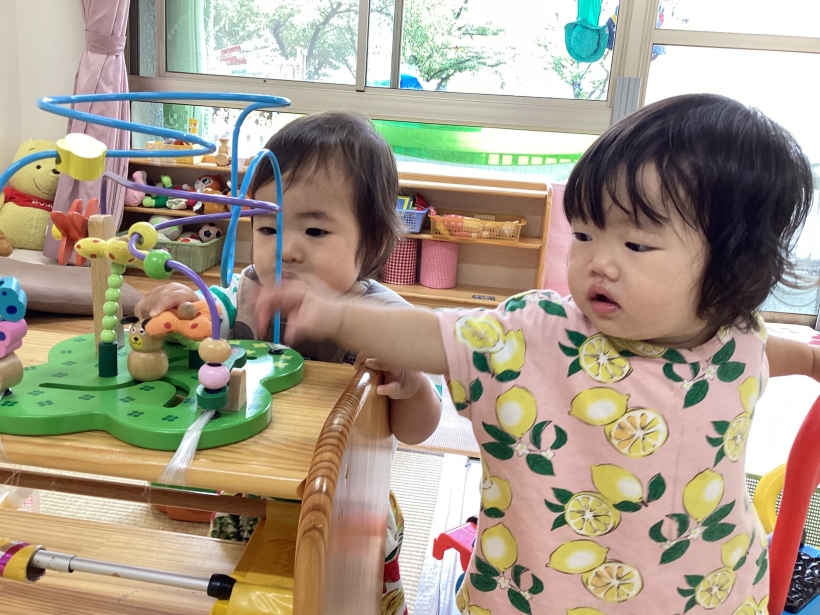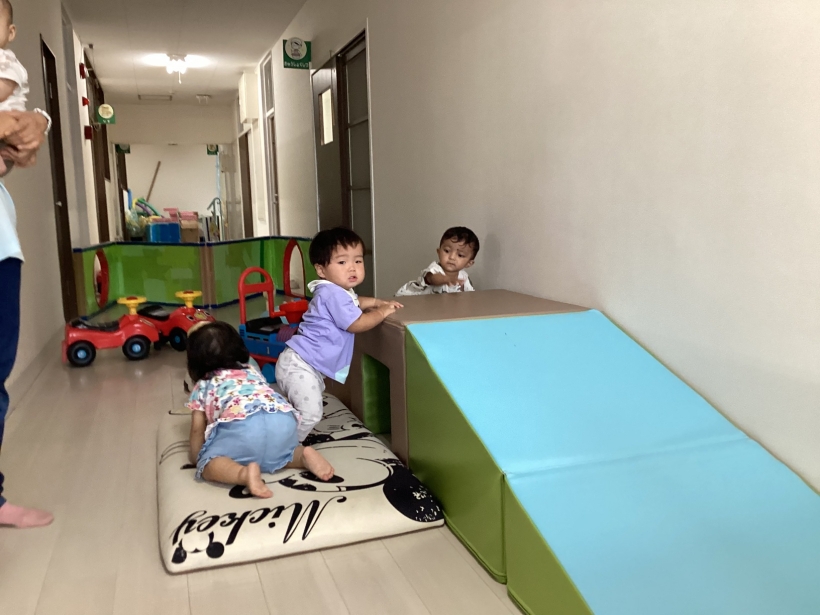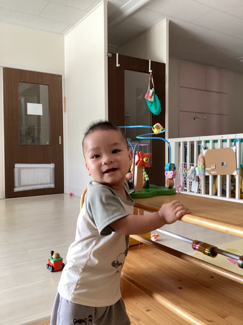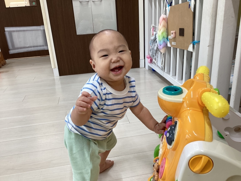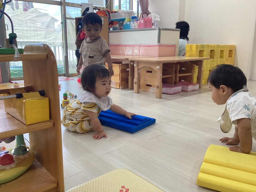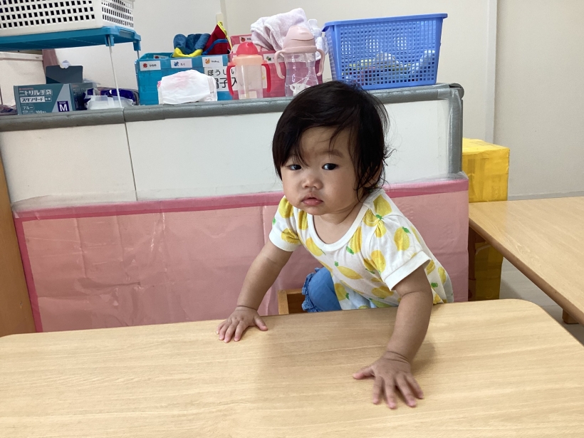 ひよこぐみだより【8月】 新しいお友達が増えさらに賑やかな毎日です! 8月の暑さにも負けず、元気いっぱいたくさん遊んでいます。 歩いたり、ハイハイしたり、興味のあるおもちゃや場所をめがけてお部屋や廊下を動き回り、いろいろな場所で遊ぶことを楽しんでいます。 食べることが大好きな子どもたち。 保育士がおやつや給食の準備を始めると、自分から椅子に座ろうとする姿が見られます。
