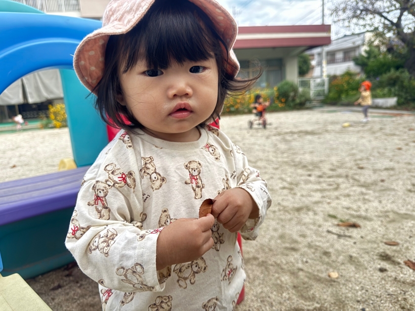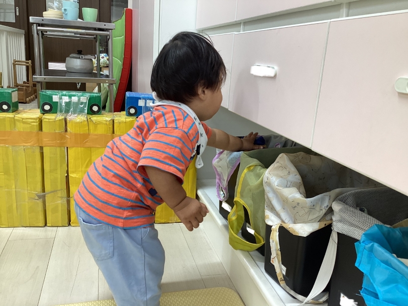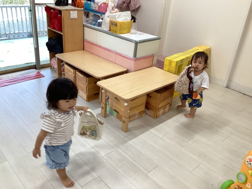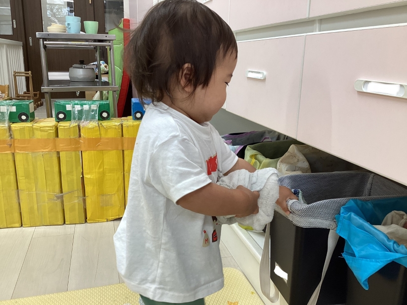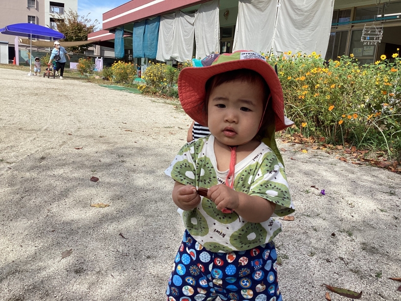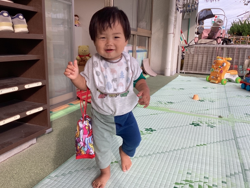 ひよこぐみだより【10月】 涼しくなった園庭で秋の自然にも触れながら遊んでいます。 お部屋の中でも体をいっぱい動かして遊びます。 カバンを持ってお出掛けごっこが大好きです! 使ったエプロンや口拭きを自分でお片付けする姿が見られるようになりました!