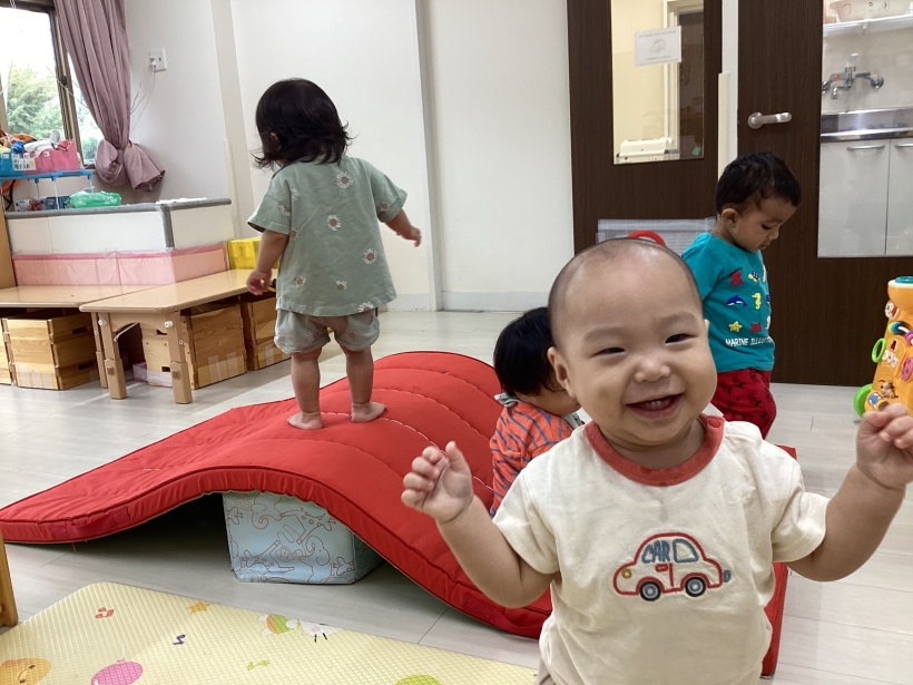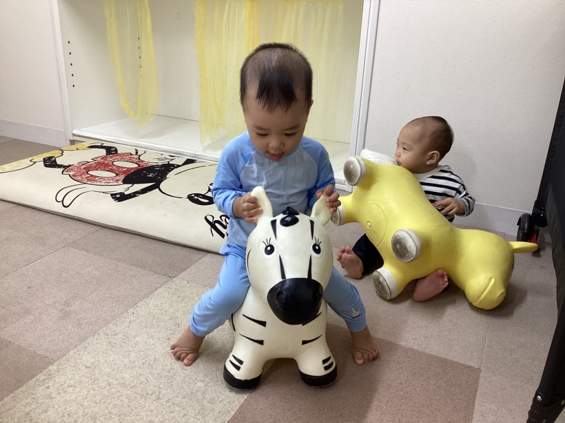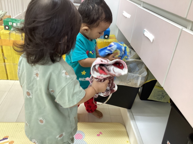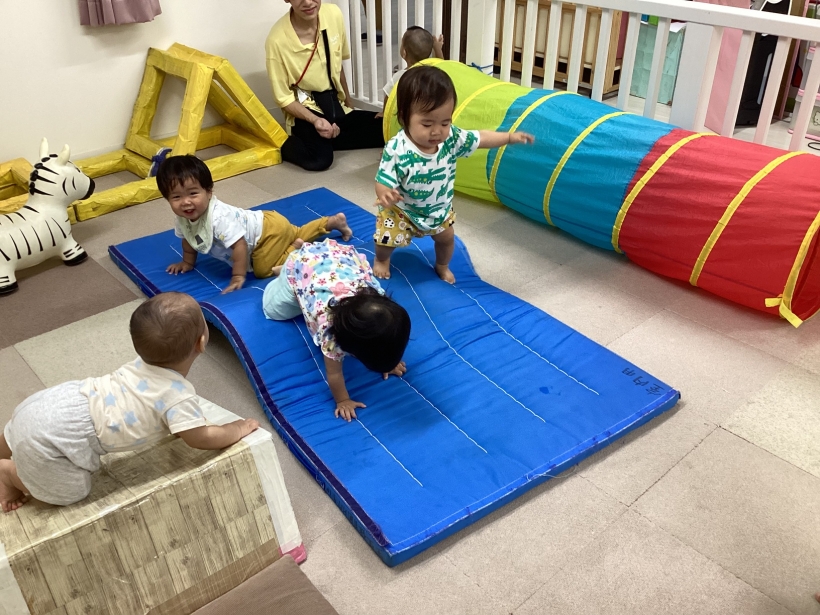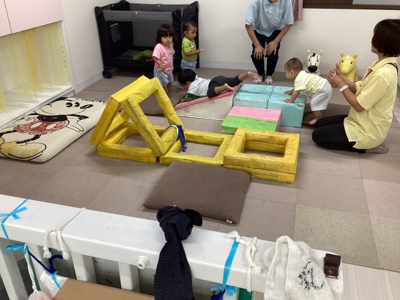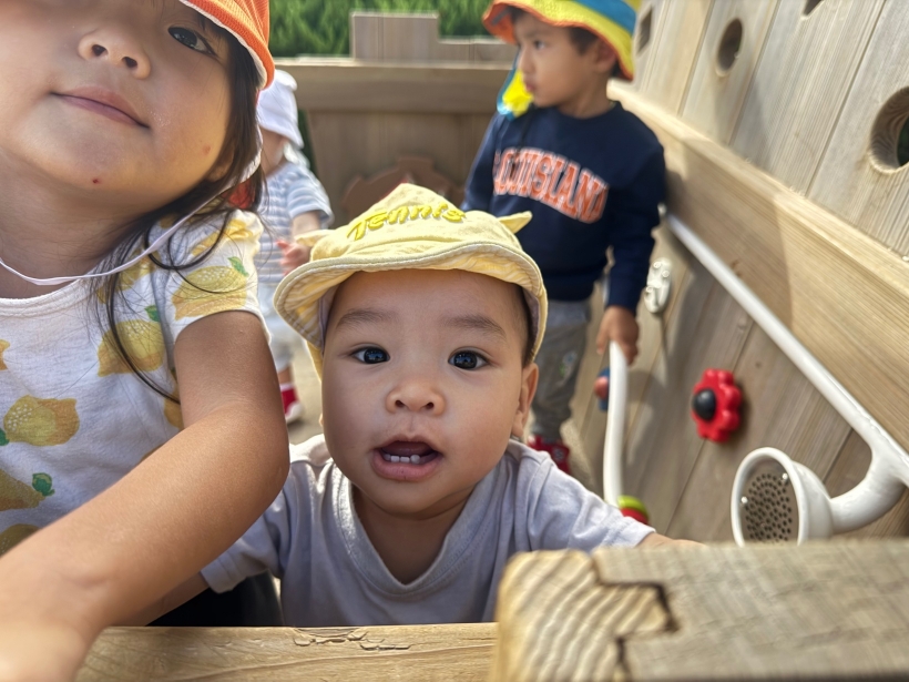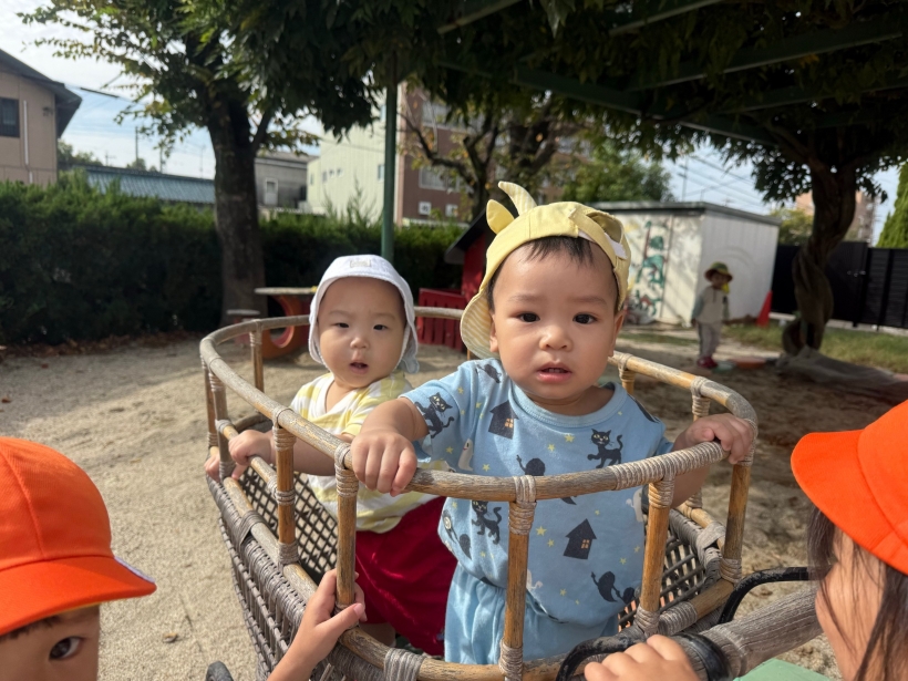 ひよこぐみだより【10月】 涼しくなった園庭で秋の自然にも触れながら遊んでいます。 お部屋の中でも体をいっぱい動かして遊びます。 カバンを持ってお出掛けごっこが大好きです! 使ったエプロンや口拭きを自分でお片付けする姿が見られるようになりました!