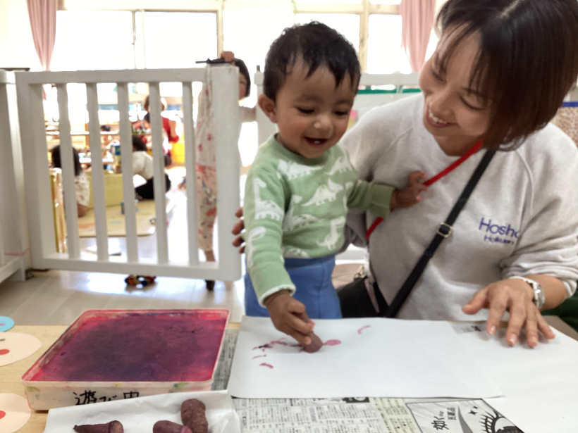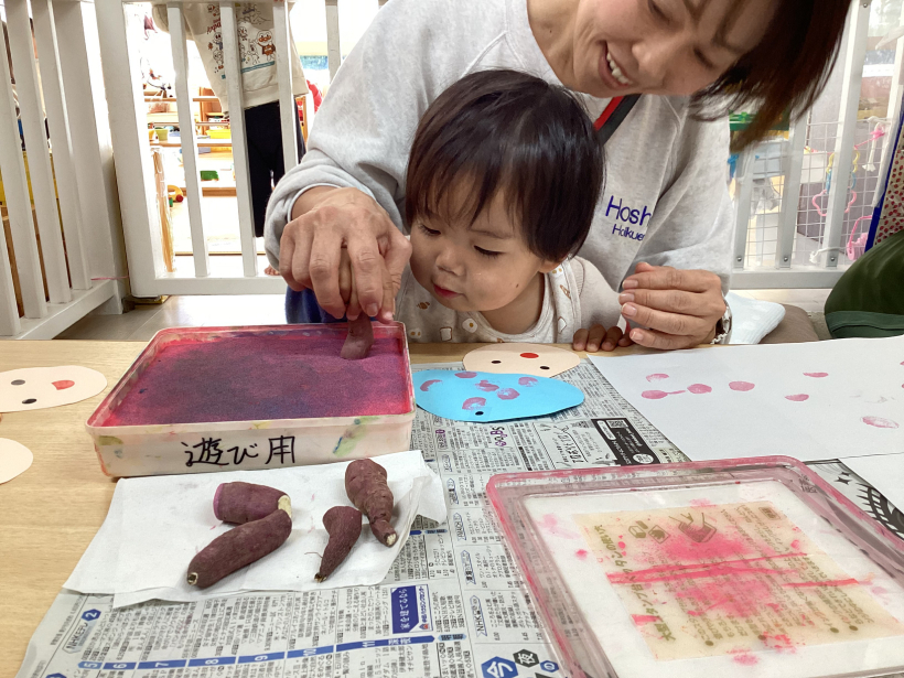 サツマイモのスタンプは保育士と一緒にポンポンと楽しく押していました!