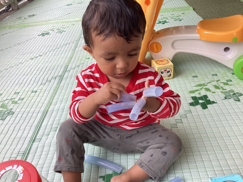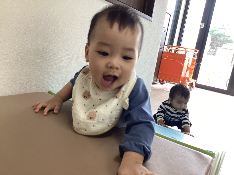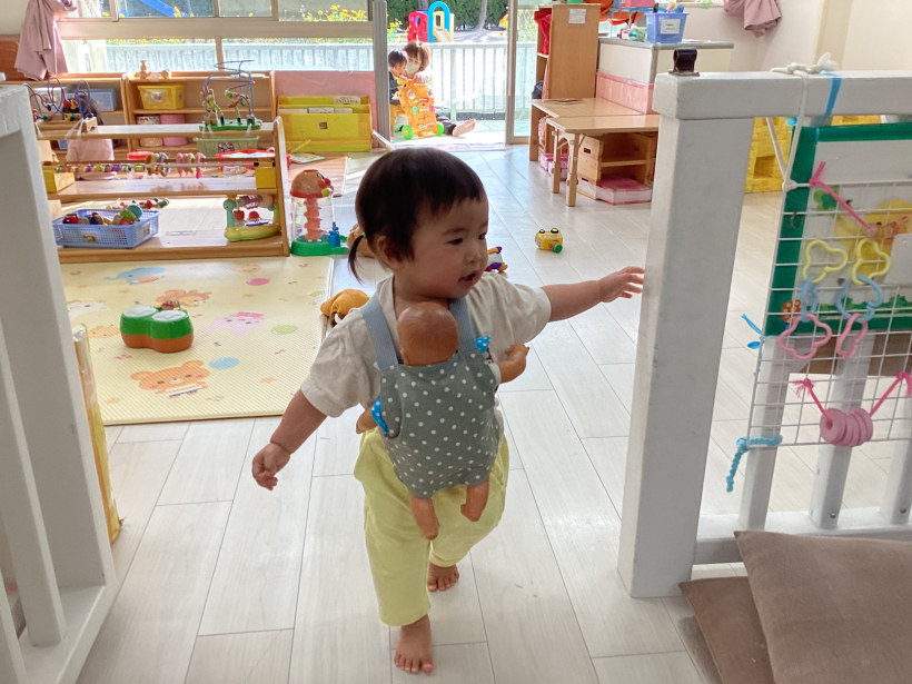 お部屋の中や廊下でも元気に体を動かしたり、自分なりの遊び方を試したり、また保育者に自分の思いをしぐさや声で伝えながら楽しんでいます。