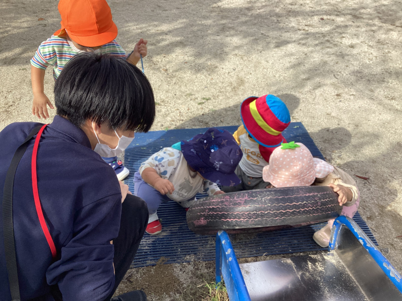 雨が降った次の日、タイヤの中に雨水が溜まっているのを見つけ、触ったり、葉っぱや石を入れて遊んでいました。