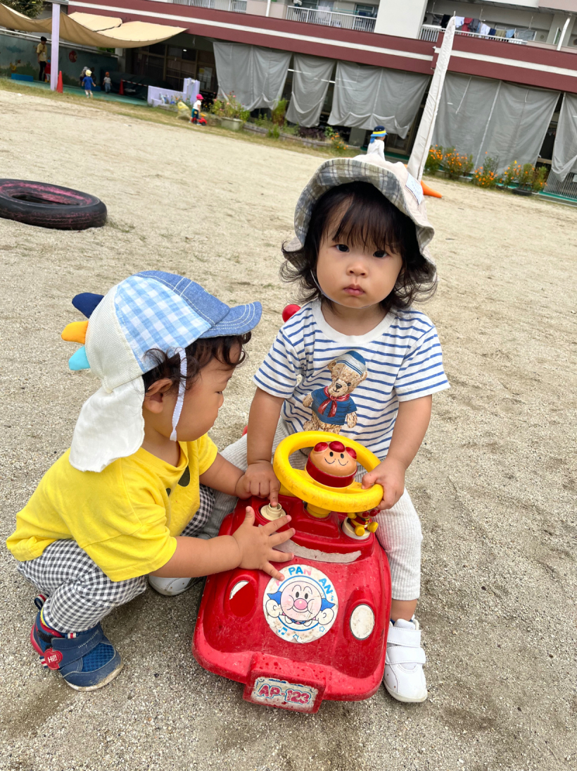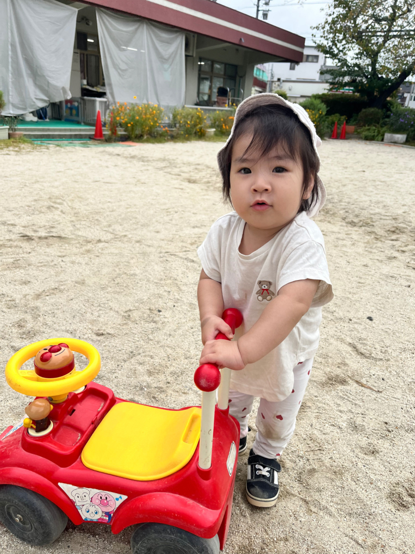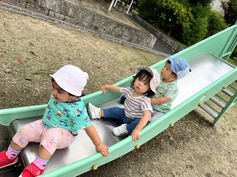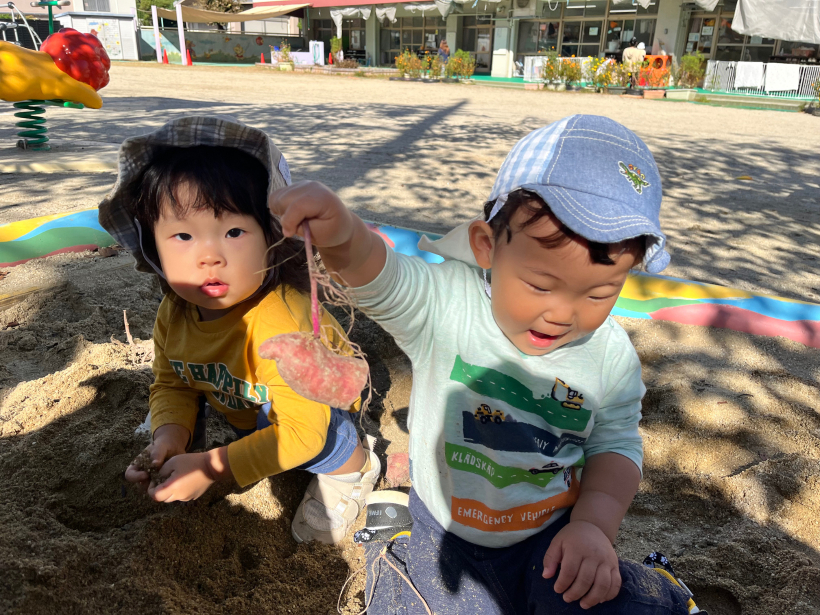 ひよこぐみだより【10月】 ふれスポでは緊張してみんな固まってしまいましたが、普段はこんな感じで遊んでいました。 園庭や公園にも少しずつ慣れてきて、好きな場所を見つけて遊べるようになってきました。 だんだん涼しくなり、風の心地良さや植物を触って秋を感じながら遊んでいます。 幼児さん達が掘ってきてくれたお芋で、園庭で芋掘り体験をしました。自分で掘れて嬉しそうな表情も見られました。
