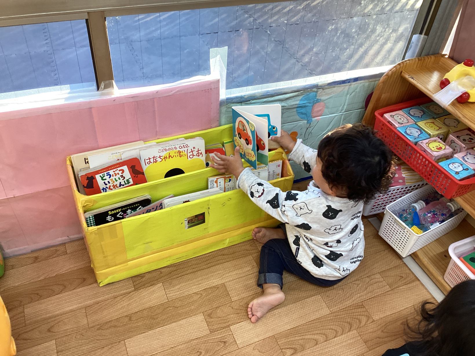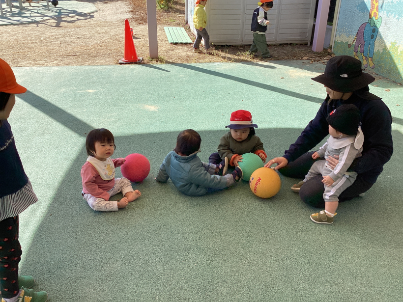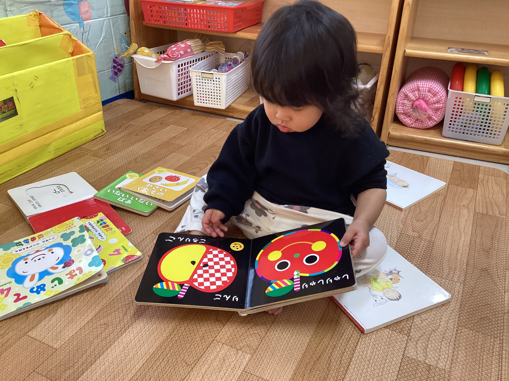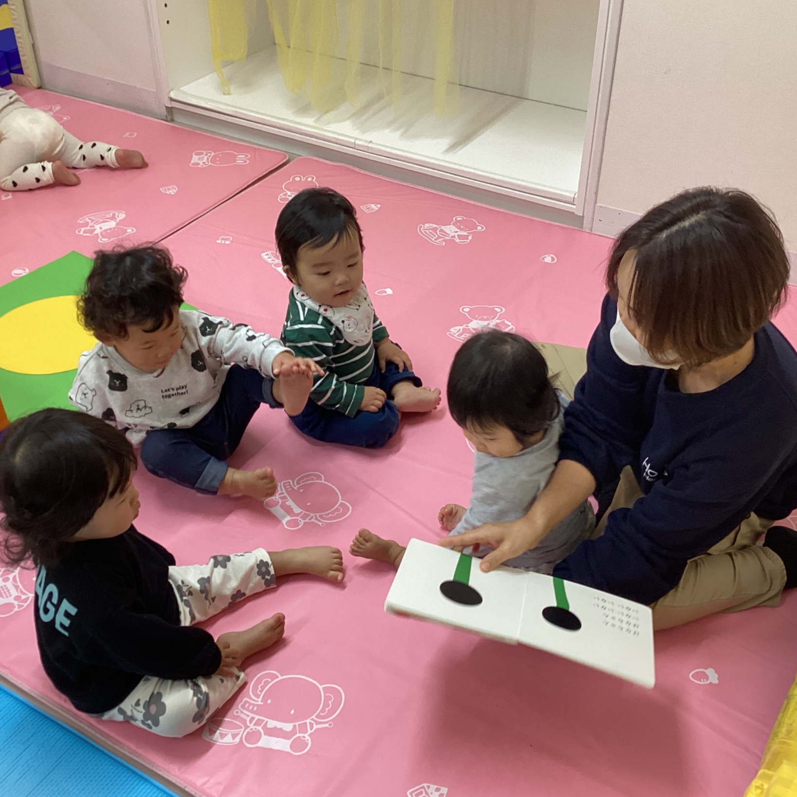 ひよこぐみだより【11月】 テラスやお部屋、園庭では保育士と一緒にお散歩したり、自分の好きな場所や興味のあるものを見つけて遊んでいます。 自然と担任保育士やクラスのお友達のいるところに集まってきて遊び出す姿が見られるようになりました。 園庭ではお兄さんお姉さんたちとも関わりながら遊んでいます。 優しくお世話してもらい、ひよこ組さんたちも嬉しそうです。 絵本にも興味を持ち、自分で見たり保育士に読んでもらったりして楽しんでいます。
