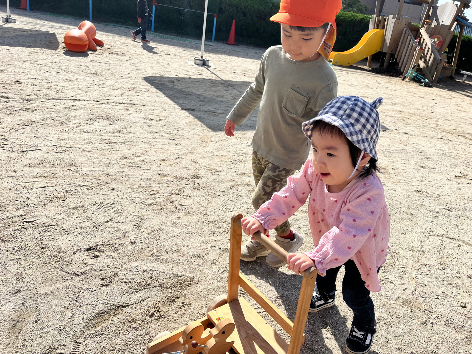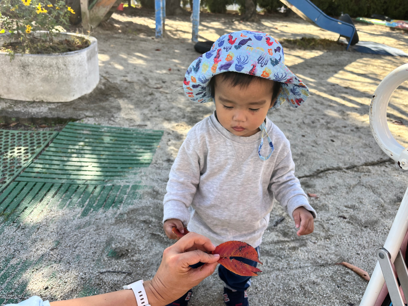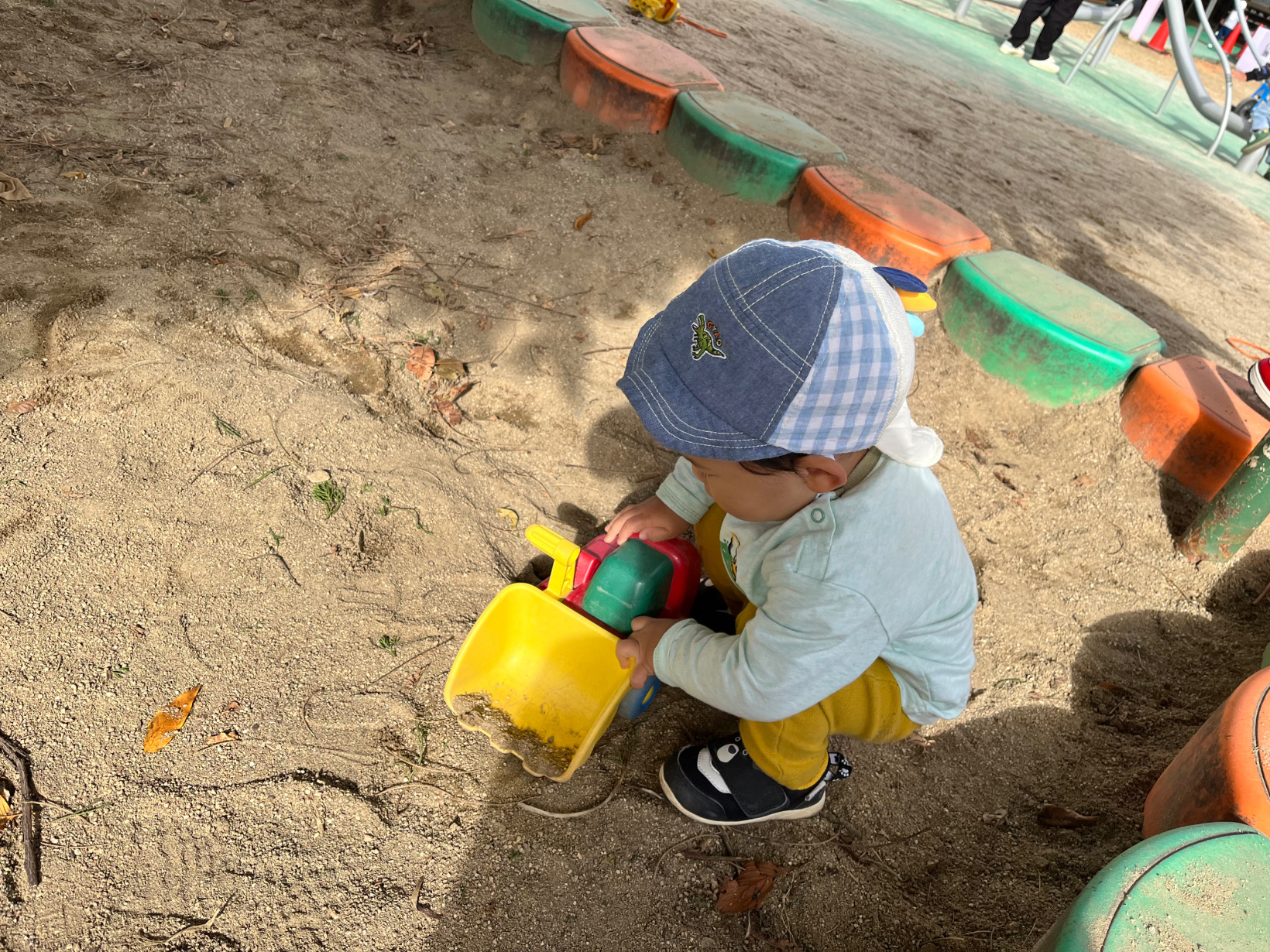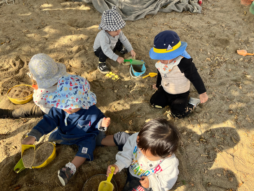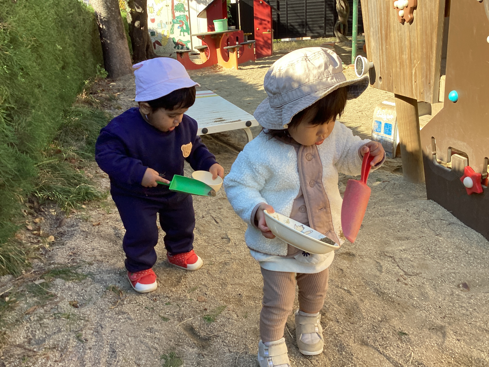 ひよこぐみだより【11月】 テラスやお部屋、園庭では保育士と一緒にお散歩したり、自分の好きな場所や興味のあるものを見つけて遊んでいます。 自然と担任保育士やクラスのお友達のいるところに集まってきて遊び出す姿が見られるようになりました。 園庭ではお兄さんお姉さんたちとも関わりながら遊んでいます。 優しくお世話してもらい、ひよこ組さんたちも嬉しそうです。 絵本にも興味を持ち、自分で見たり保育士に読んでもらったりして楽しんでいます。