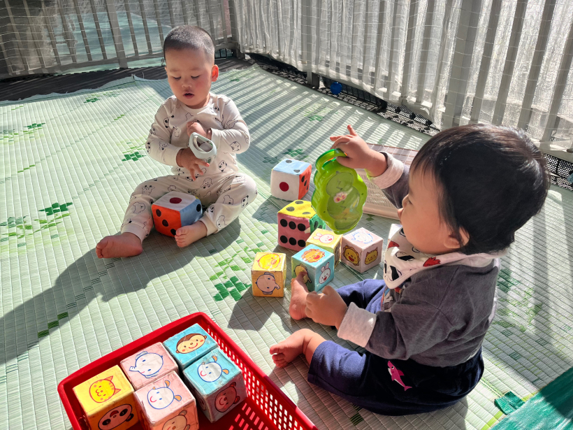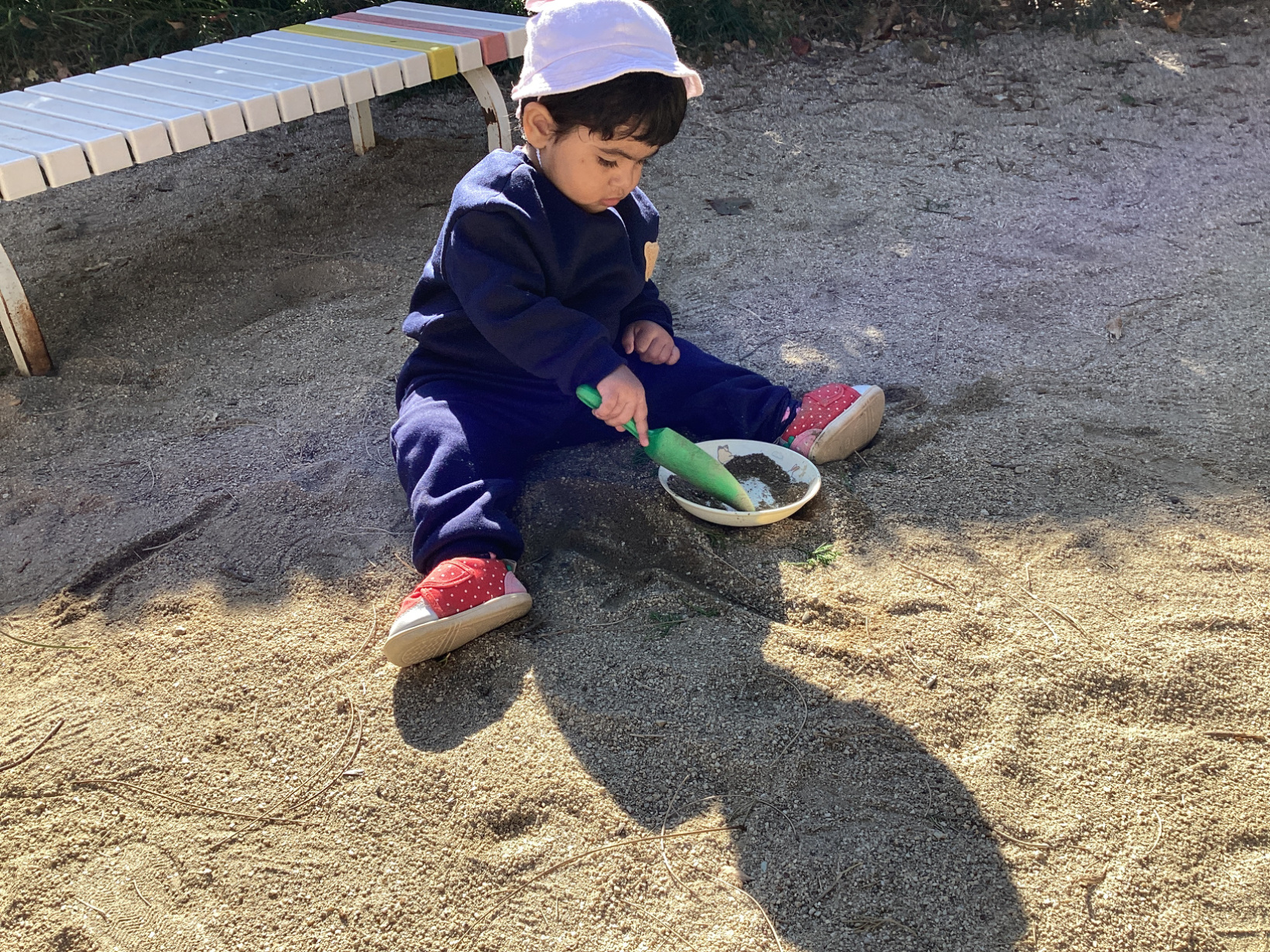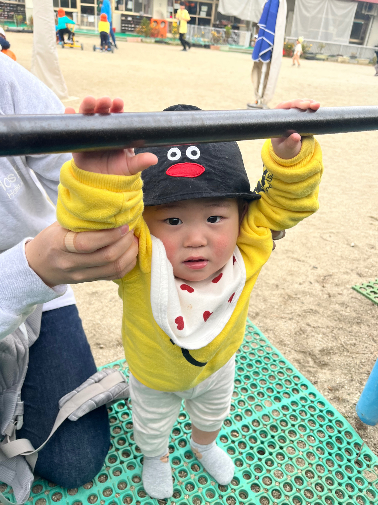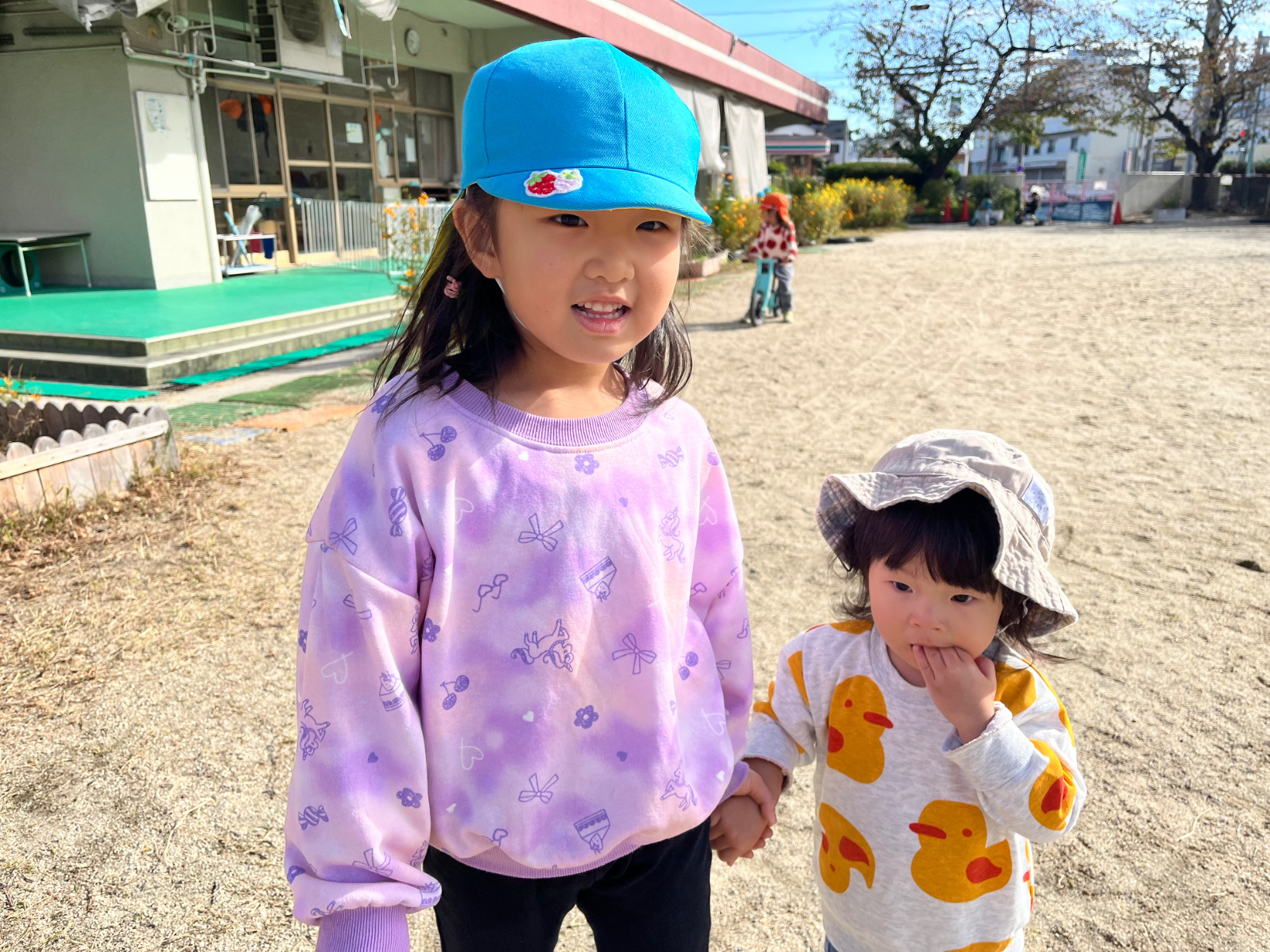 ひよこぐみだより【11月】 テラスやお部屋、園庭では保育士と一緒にお散歩したり、自分の好きな場所や興味のあるものを見つけて遊んでいます。 自然と担任保育士やクラスのお友達のいるところに集まってきて遊び出す姿が見られるようになりました。 園庭ではお兄さんお姉さんたちとも関わりながら遊んでいます。 優しくお世話してもらい、ひよこ組さんたちも嬉しそうです。 絵本にも興味を持ち、自分で見たり保育士に読んでもらったりして楽しんでいます。