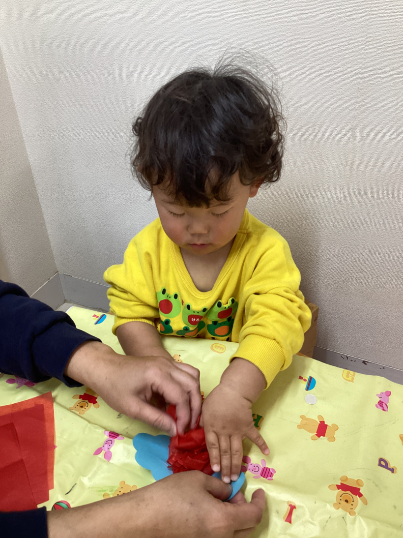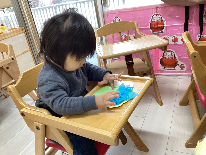 お花紙をクシャッとして鬼のお面を作りました!