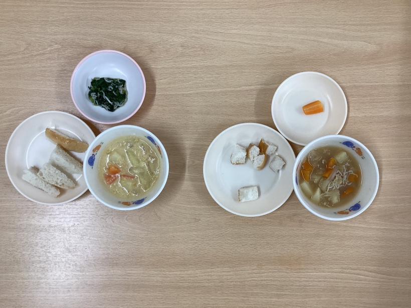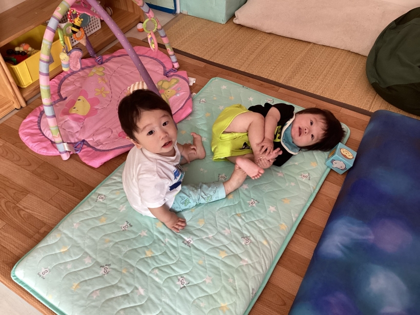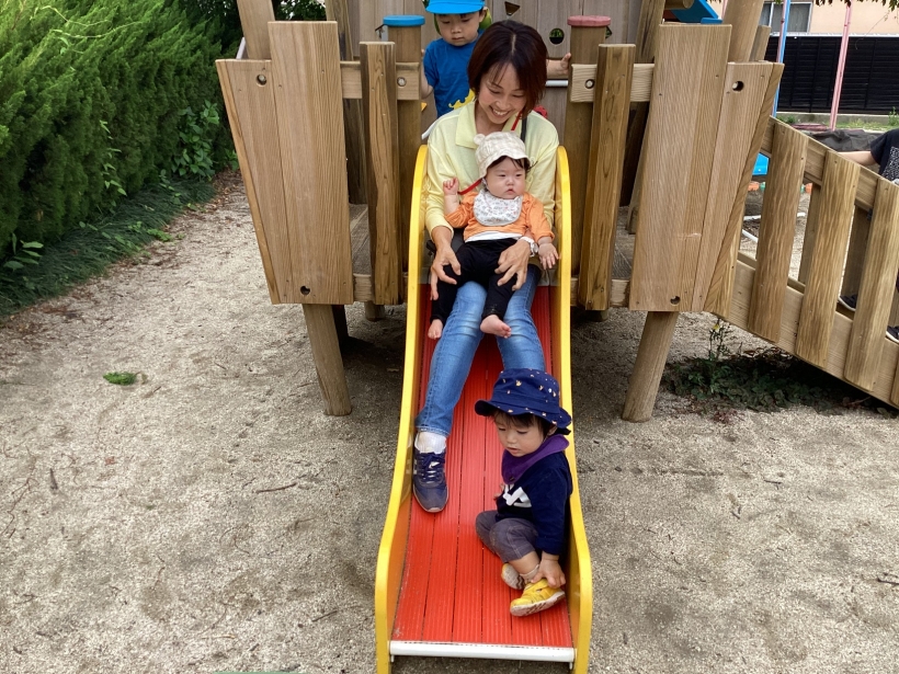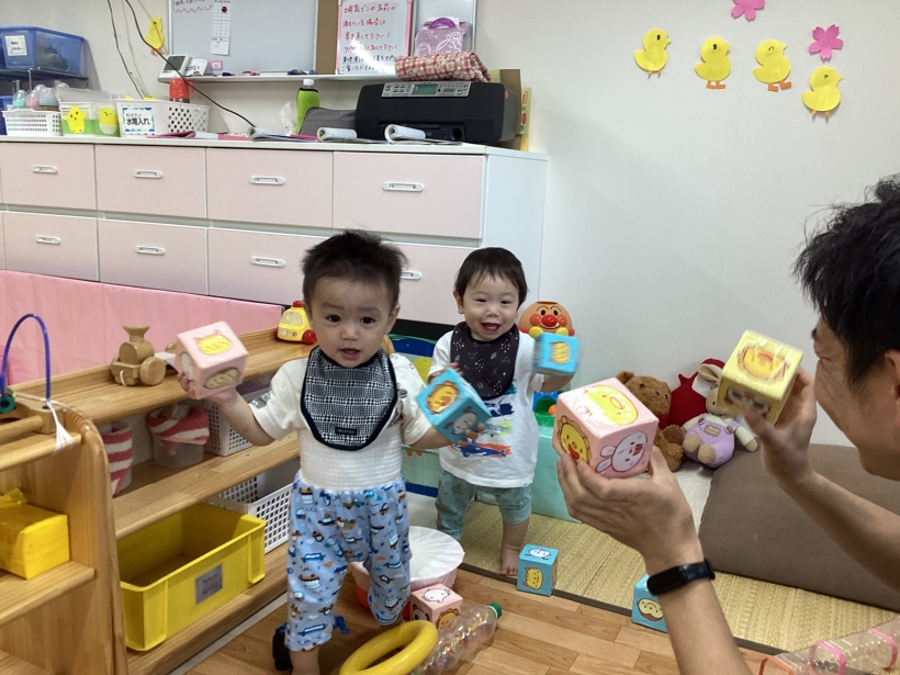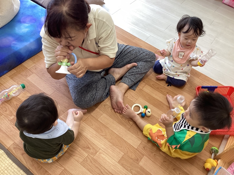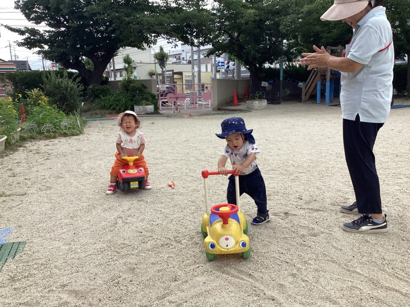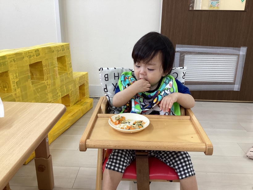 ひよこぐみだより【6月】 外の気持ちいい風の中ですやすや‥ 離乳食です。 左が完了期食で、右が後期食です。 モグモグ、、手づかみ食べで上手に食べます。 歌に合わせてシャンシャン♪音を鳴らして遊びます。 お外大好き!自分から帽子や靴を持って来る姿も見られます。 お友達が気になり近寄って行く姿も見られます。