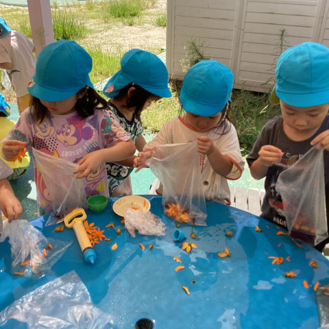 9月の水遊びでは、花びらや葉っぱを使って色水遊びをしました。 ビニー...