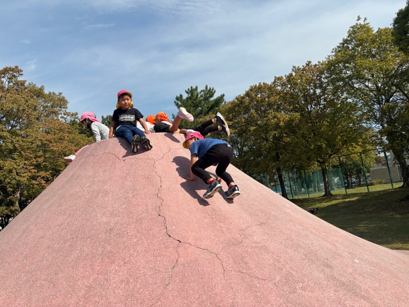 山の滑り台を下から駆け上ったり、友だちと「せーの!」で滑ってみたり、シーソーや石跳びでジャンケン対決をしたりして楽しみました。