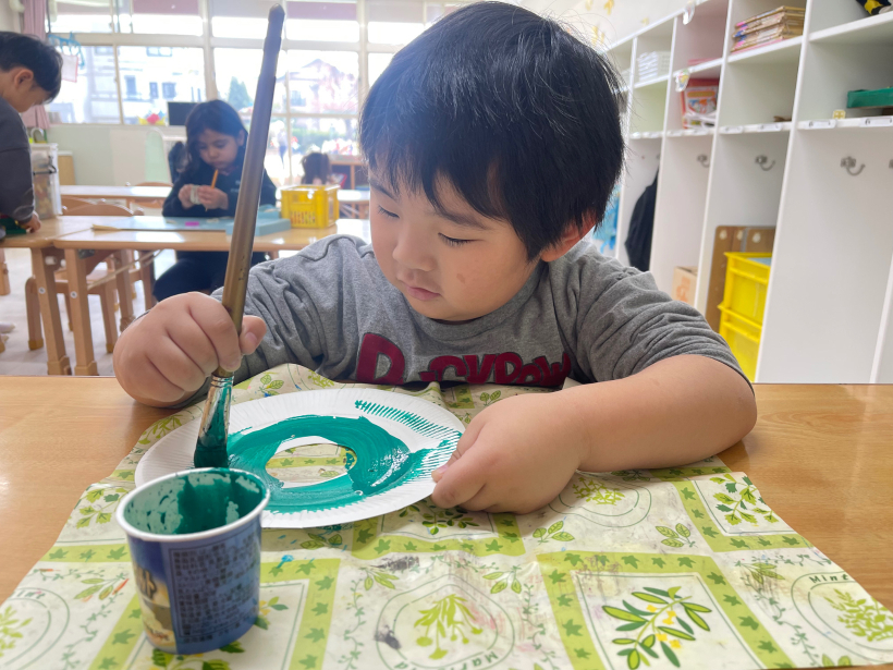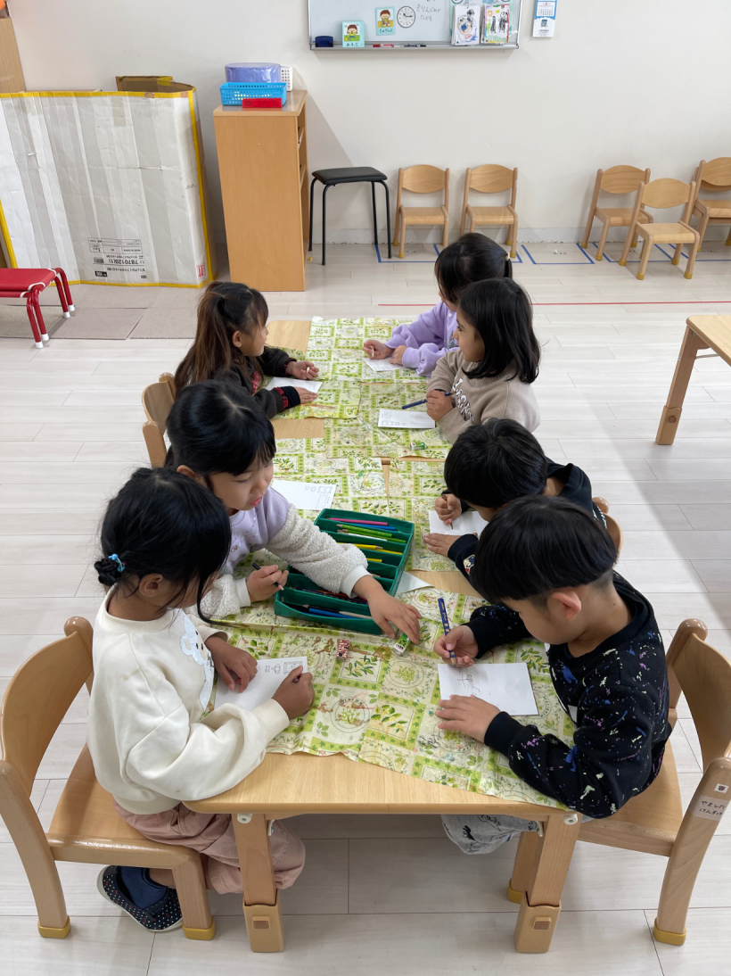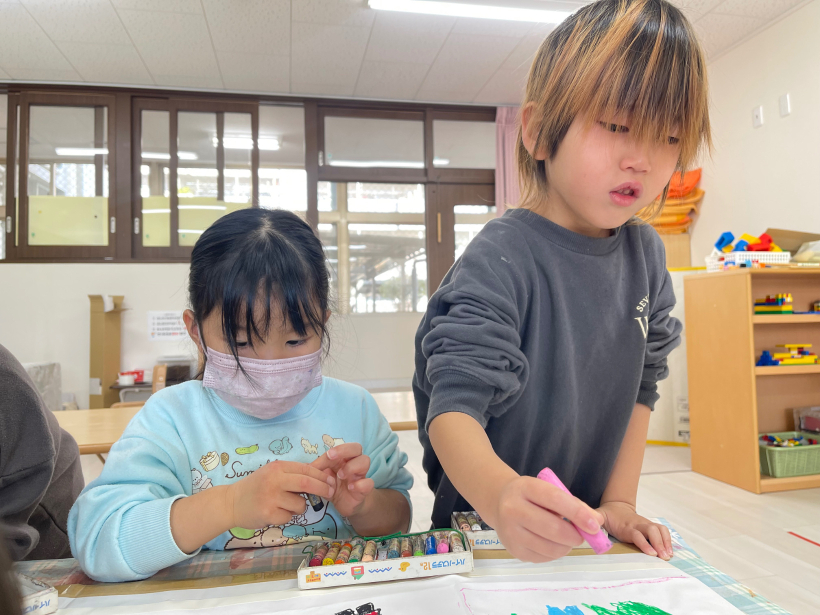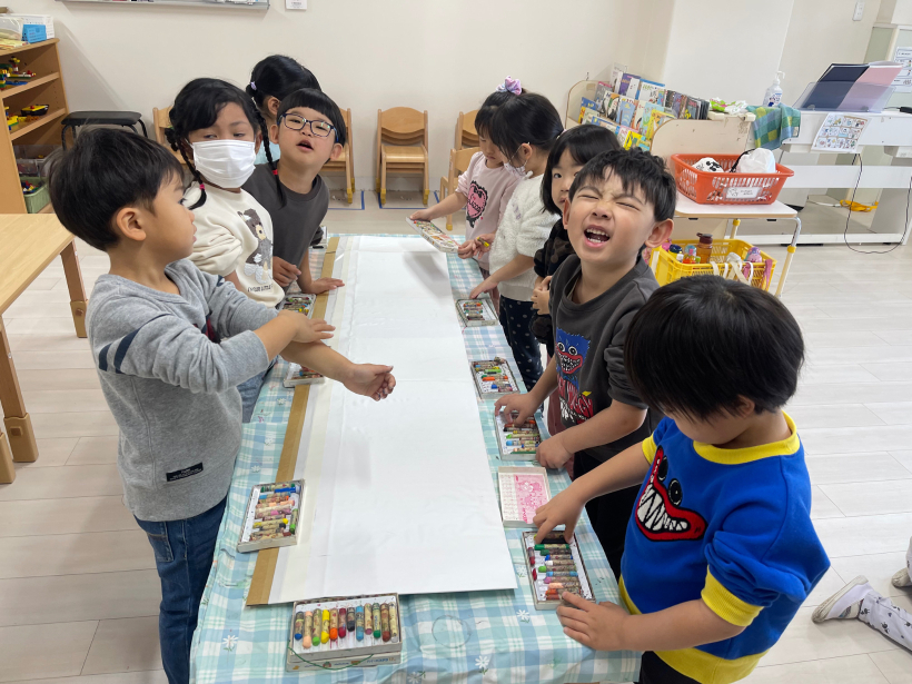 「ここ、ぬってもいい?」と慎重な子や「あ、せんからでちゃった」と大胆な子も。