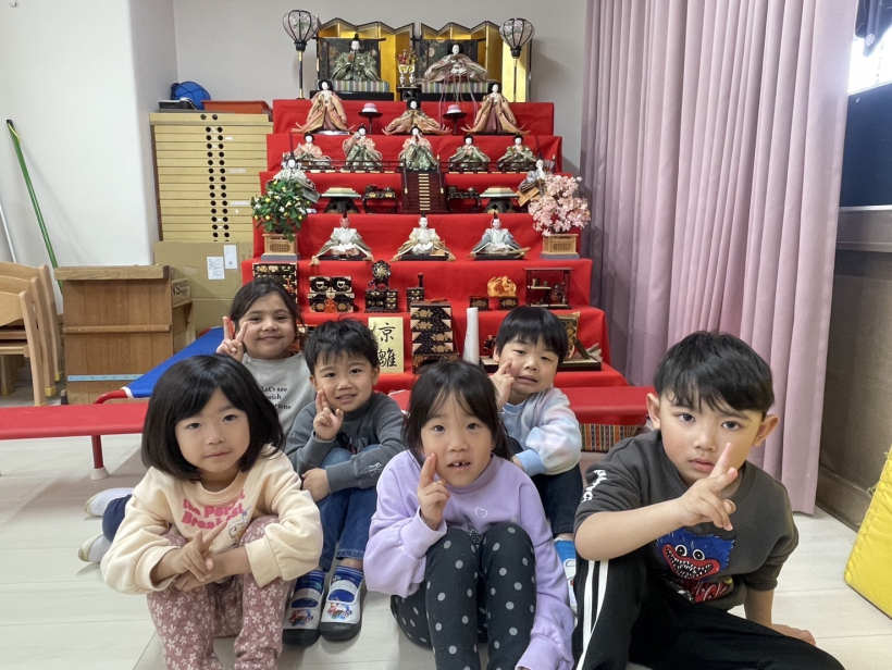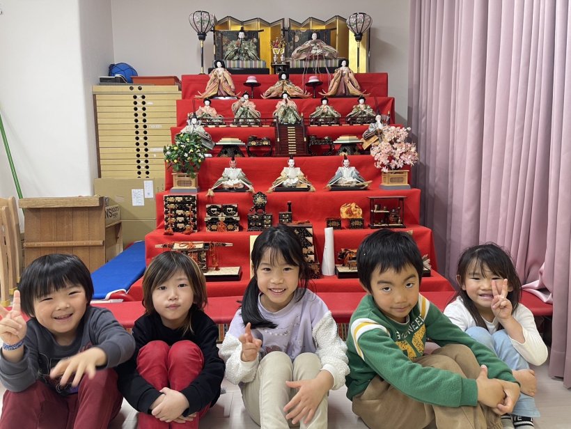 ひな壇の前で記念撮影。「はい、チーズ!」