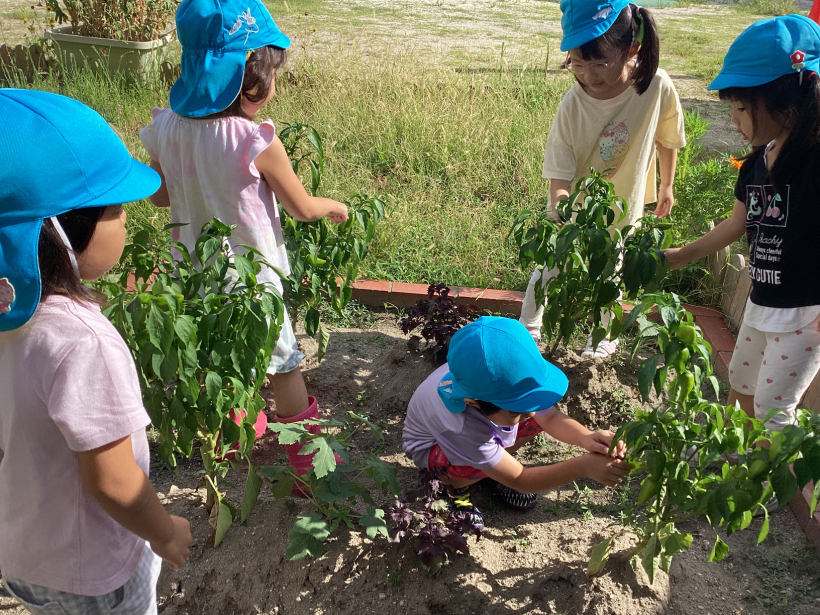 みんなで育てたピーマンとオクラの収穫をしました。