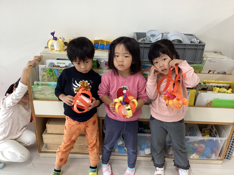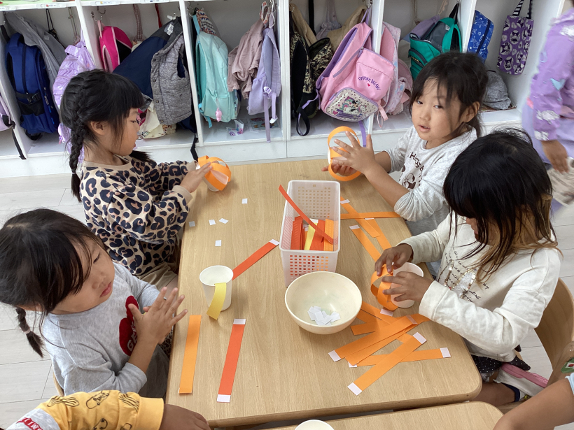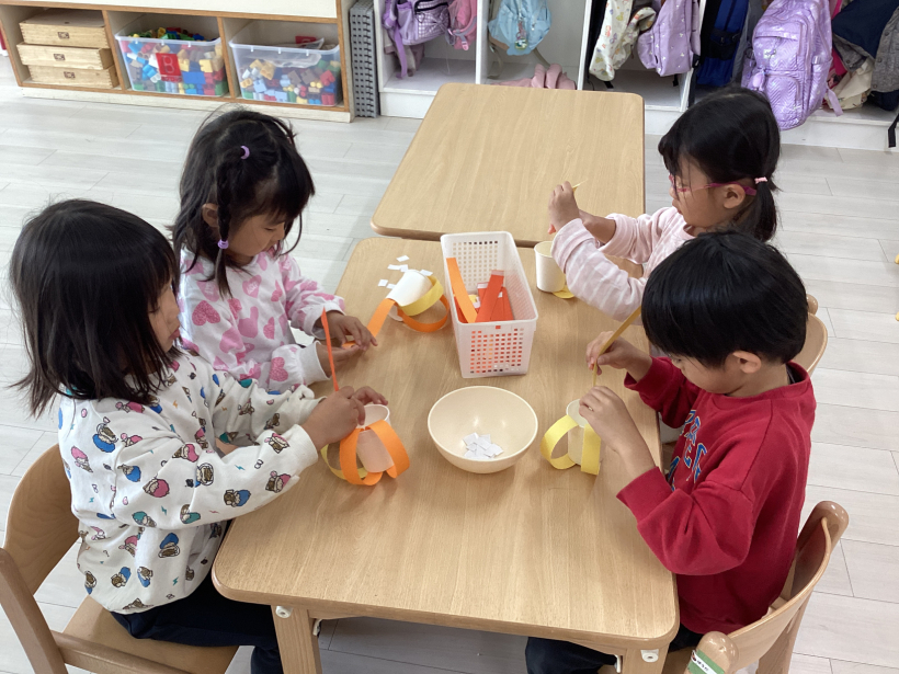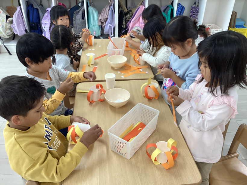 「オレンジがいい!」「黄色にするー!」と好きな色を選びながら紙コップに画用紙を貼って作りました。