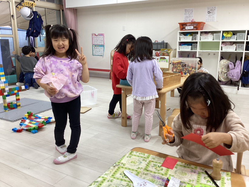 画用紙を丸く切ってお金を作ったり、ヨーグルトカップと毛糸で糸電話を作ったり、トイレットペーパーの芯で双眼鏡を作ったりと様々な物を作って楽しんでいます!
