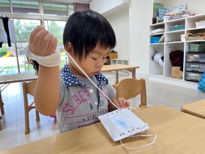 完成した財布はお店屋さんごっこで使うことを伝えると、「はやく、おかねいれておかいものしたいな」「なんのおみせがあるのかな?」とお店屋さんごっこを楽しみにしている子どもの姿がありました☆
