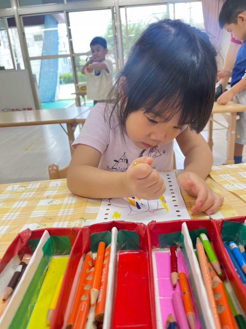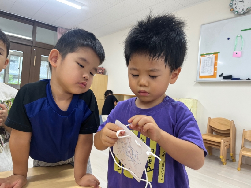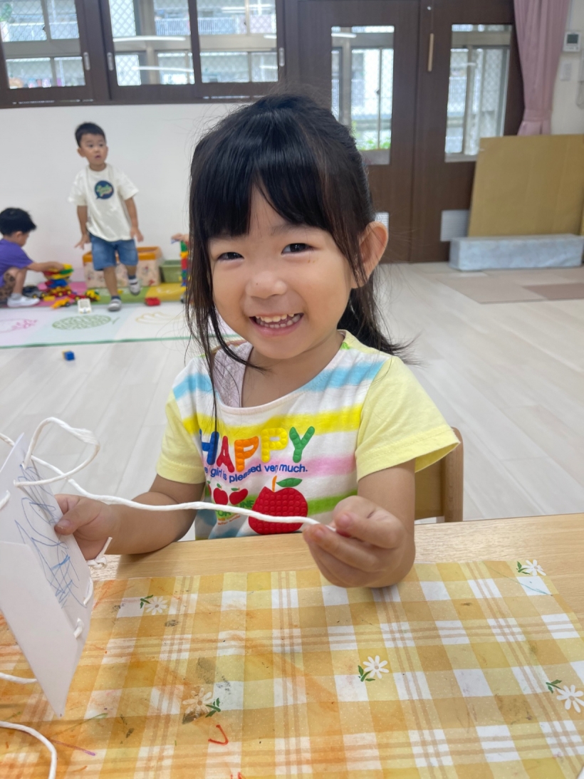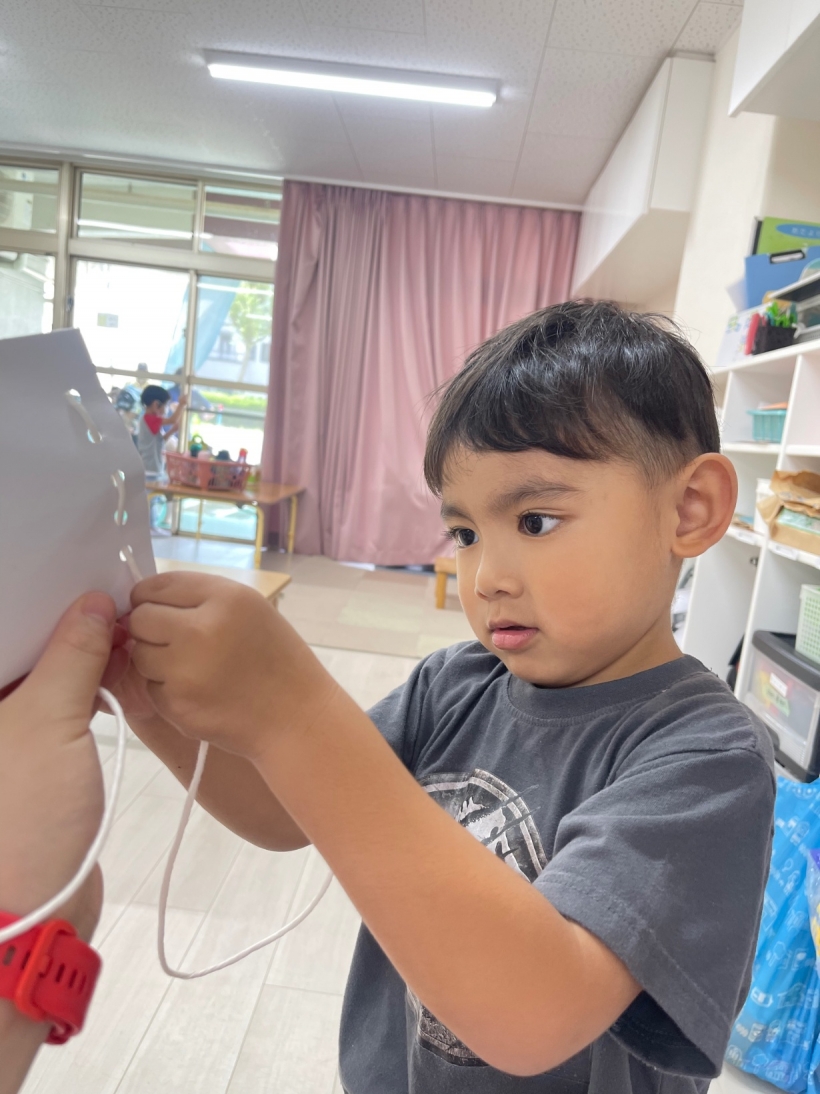 初めはなかなか上手くひもが通せずに「どうやってやるの?」「できないよ〜」と苦戦する事もありましたが、保育者と一緒にやってみたり、だんだんコツを掴むと自分で上手にひもを通すことができました♪