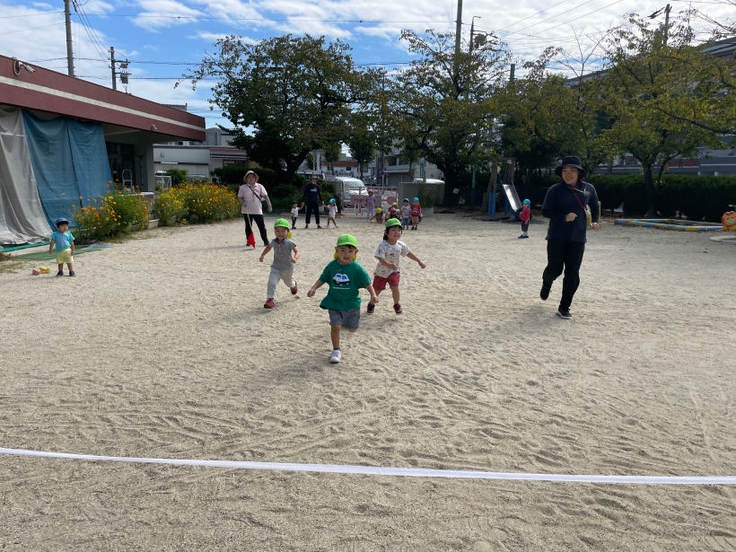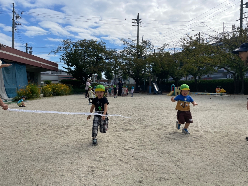 運動会練習では名前を呼ばれると元気よく返事をして、「よーいどんっ!」の合図でゴールテープまで頑張って走る姿があります♪