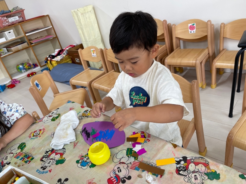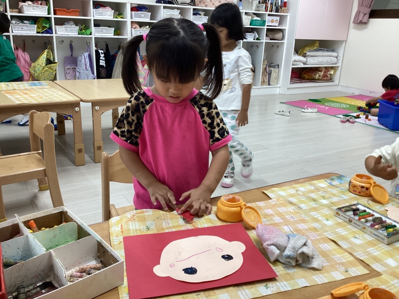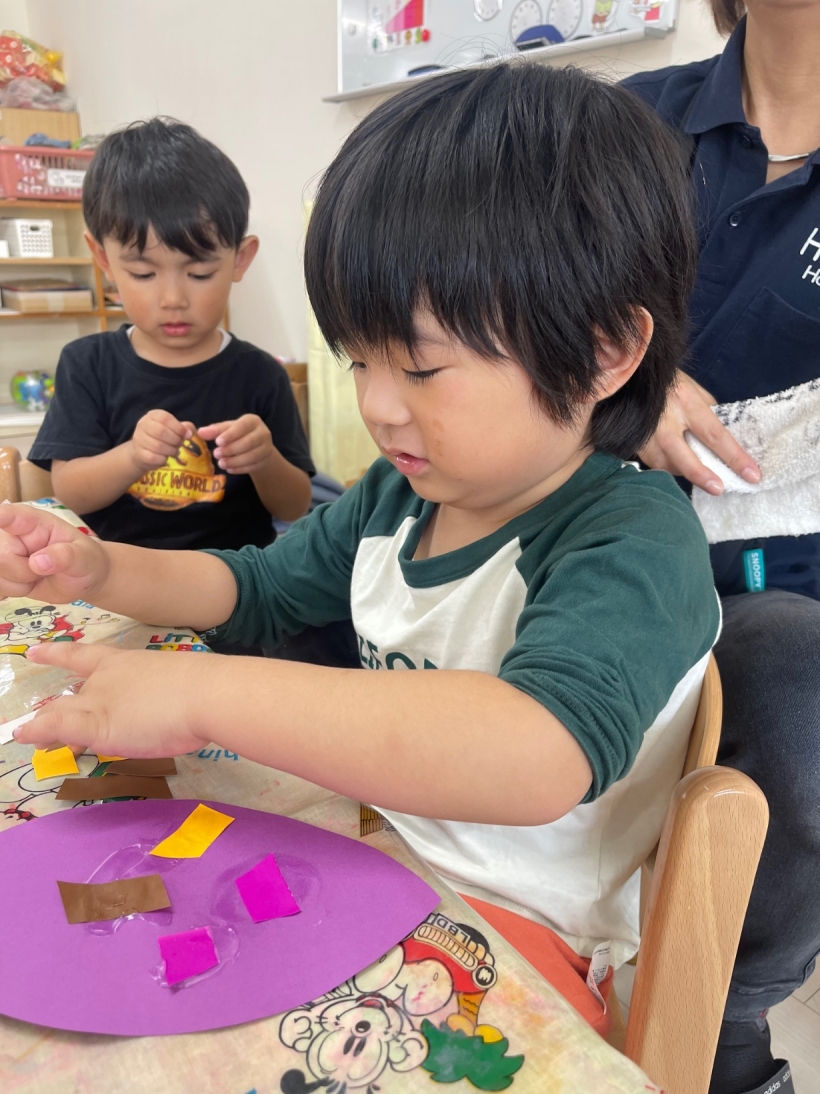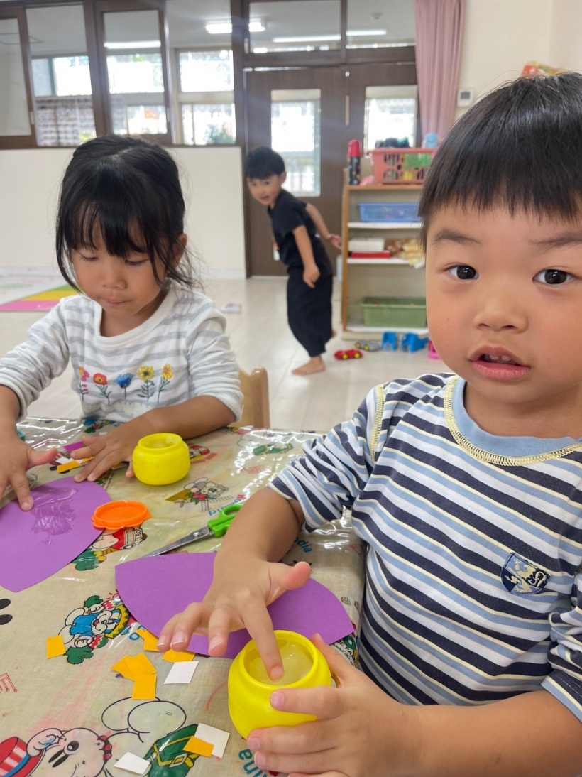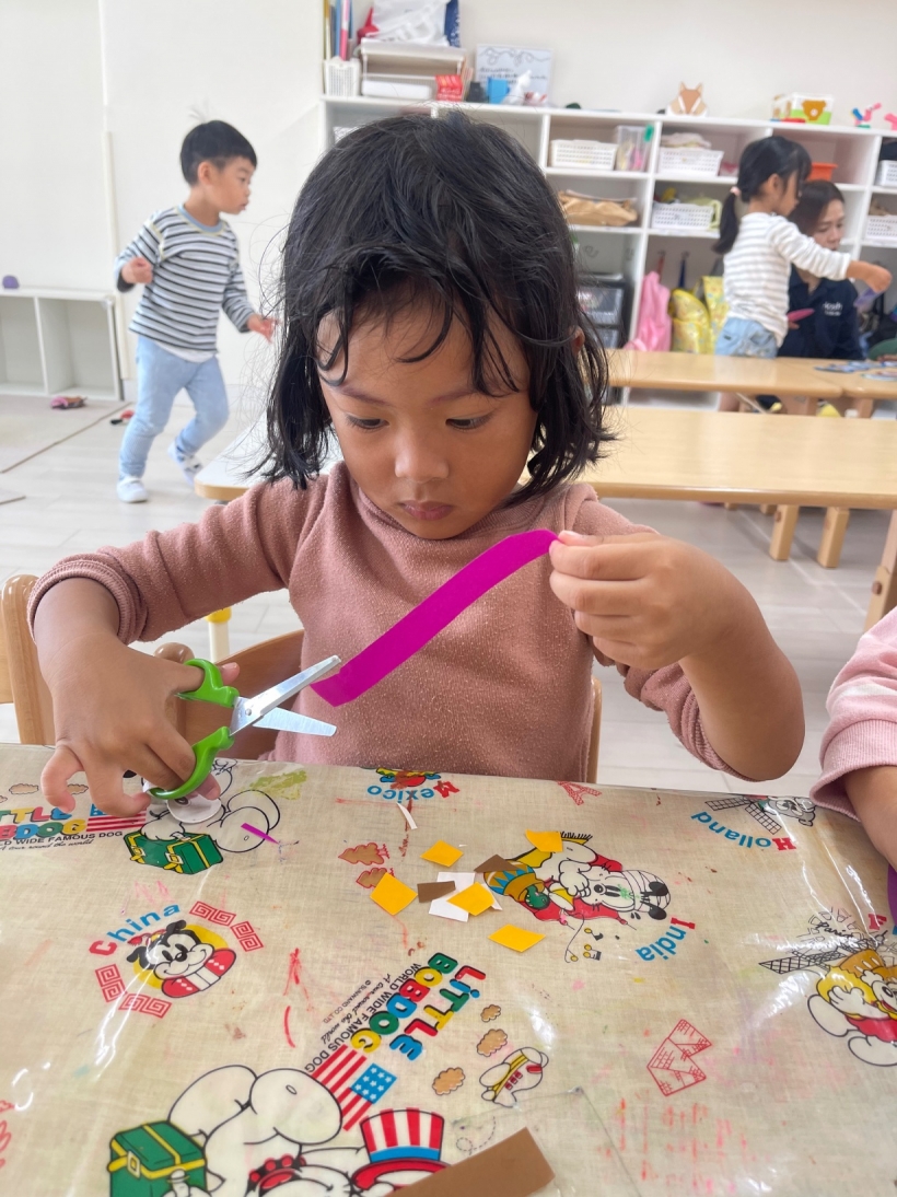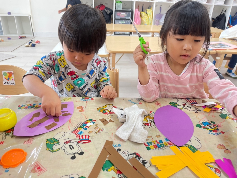 高く澄んだ空の下、のびのびと体を動かすことを楽しんだり、芸術の秋にふさわしく、製作に夢中になる子どもたち。