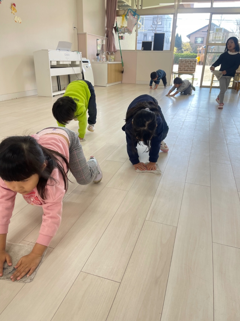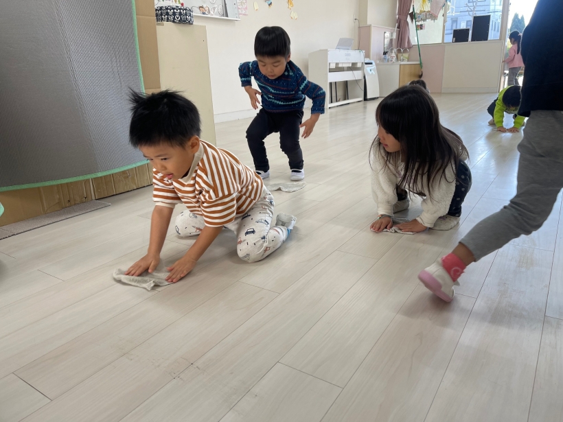 自分のロッカーを綺麗に拭いたり、床を雑巾がけしながら「これ、たのしい!もっとやりたい!」と言う子どもたち。