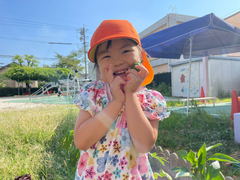 幼児3クラスで育てたピーマンとオクラの収穫をしました。