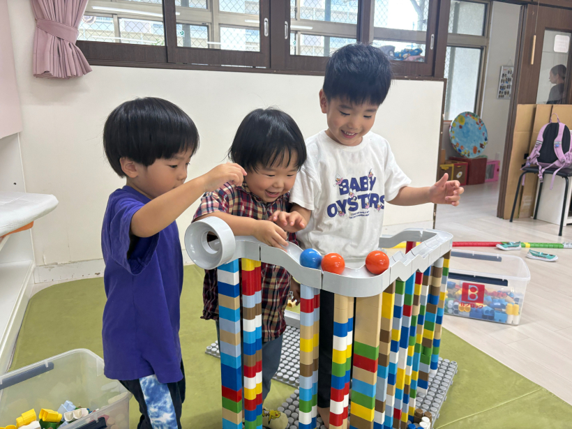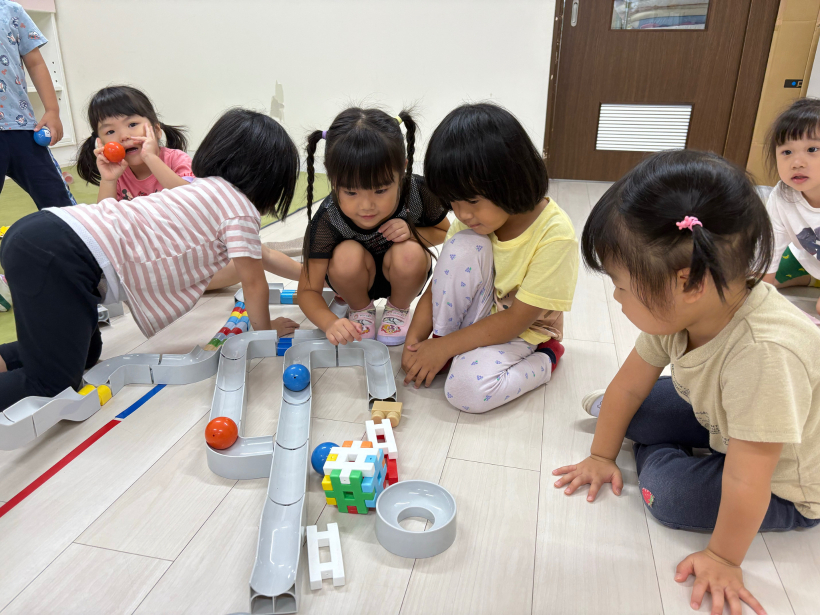 みんなで協力して道をつくり、ボールを転がして遊んでいます。
